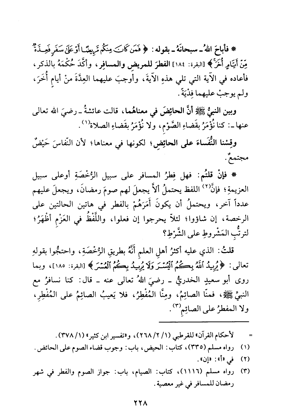* فأباحَ اللهُ -سبحانَهُ- بقوله: {فَمَنْ كَانَ مِنْكُمْ مَرِيضًا أَوْ عَلَى سَفَرٍ فَعِدَّةٌ مِنْ أَيَّامٍ أُخَرَ} [البقرة: 184] الفطرَ للمريضِ والمسافِر، وأكَدَ حُكْمَهُ بالذكر، فأعاده في الآية التي تلي هذهِ الآيةَ، وأوجبَ عليهما العِدَّةَ منْ أيامٍ أُخَرَ، ولم يوجبْ عليهما فِدْيَةً.