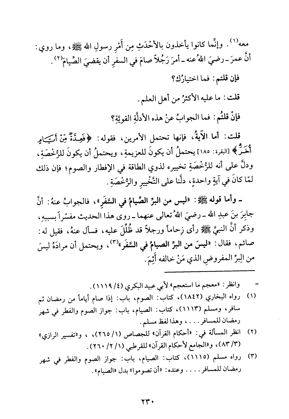 - وأما قوله - صلى الله عليه وسلم -: "ليس من البرِّ الصِّيامُ في السَّفَرِ"، فالجوابُ عنهُ: أنَّ جابِرَ بنَ عبدِ الله -رضيَ اللهُ تعالى عنهما- روى هذا الحديث مفسّراً بسببهِ، وذكر أنَّ النبيَّ - صلى الله عليه وسلم - رأى زِحاماً ورجلاً قد ظُلِّل عليه، فسأل عنهُ، فقيل له: صائم، فقال: "ليسَ من البرِّ الصيامُ في السَّفَر" (¬3)، ويحتمل أن مرادَهُ ليسَ من الِبرِّ المفروضِ الذي مَنْ خالفه أَثِمَ.
