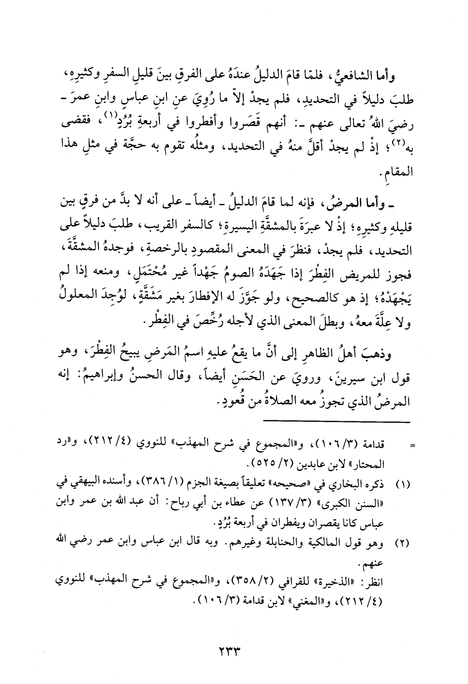 وأما الشافعيُّ، فلمّا قامَ الدليلُ عندَهُ على الفرقِ بينَ قليلِ السفرِ وكثيرِهِ، طلبَ دليلاً في التحديدِ، فلم يجدْ إلاّ ما رُوِيَ عنِ ابنِ عباسٍ وابنِ عمرَ -رضيَ اللهُ تعالى عنهم-: أنهم قَصَروا وأفطروا في أربعةِ بُرُدٍ (¬1)، فقضى به (¬2)؛ إذْ لم يجدْ أقل منهُ في التحديد، ومثلُه تقوم به حجَّة في مثلِ هذا المقامِ.