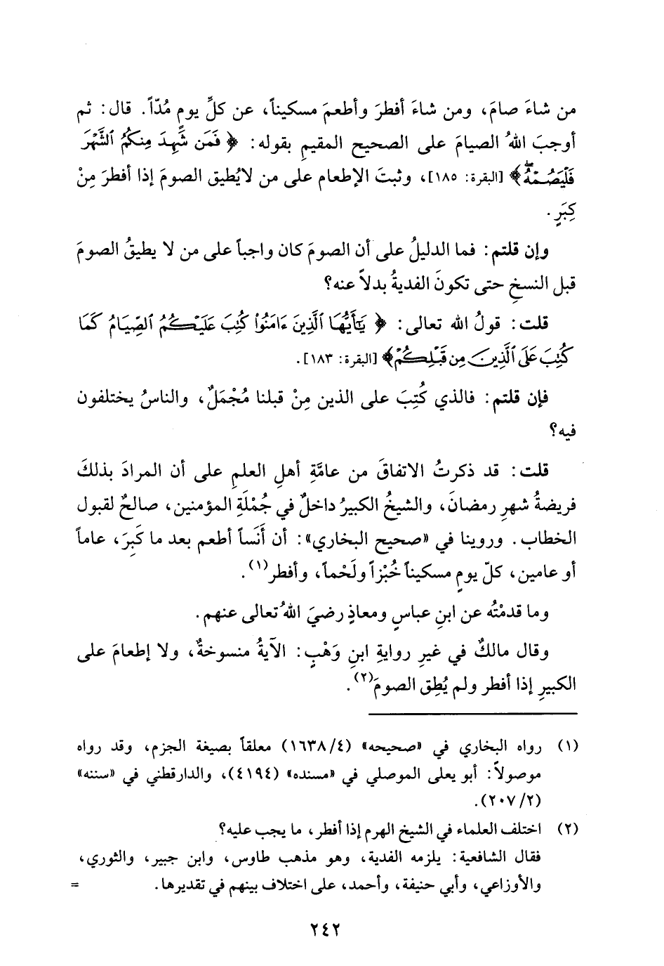 قلت: قد ذكرتُ الاتفاقَ من عامَّةِ أهلِ العلمِ على أن المرادَ بذلكَ فريضةُ شهرِ رمضانَ، والشيخُ الكبيرُ داخلٌ في جُمْلَةِ المؤمنين، صالحٌ لقبول الخطاب. وروينا في "صحيح البخاري": أن أَنَساً أطعم بعد ما كَبِرَ، عاماً أو عامين، كلّ يومٍ مسكيناً خُبْزاً ولَحْماً، وأفطر (¬1).