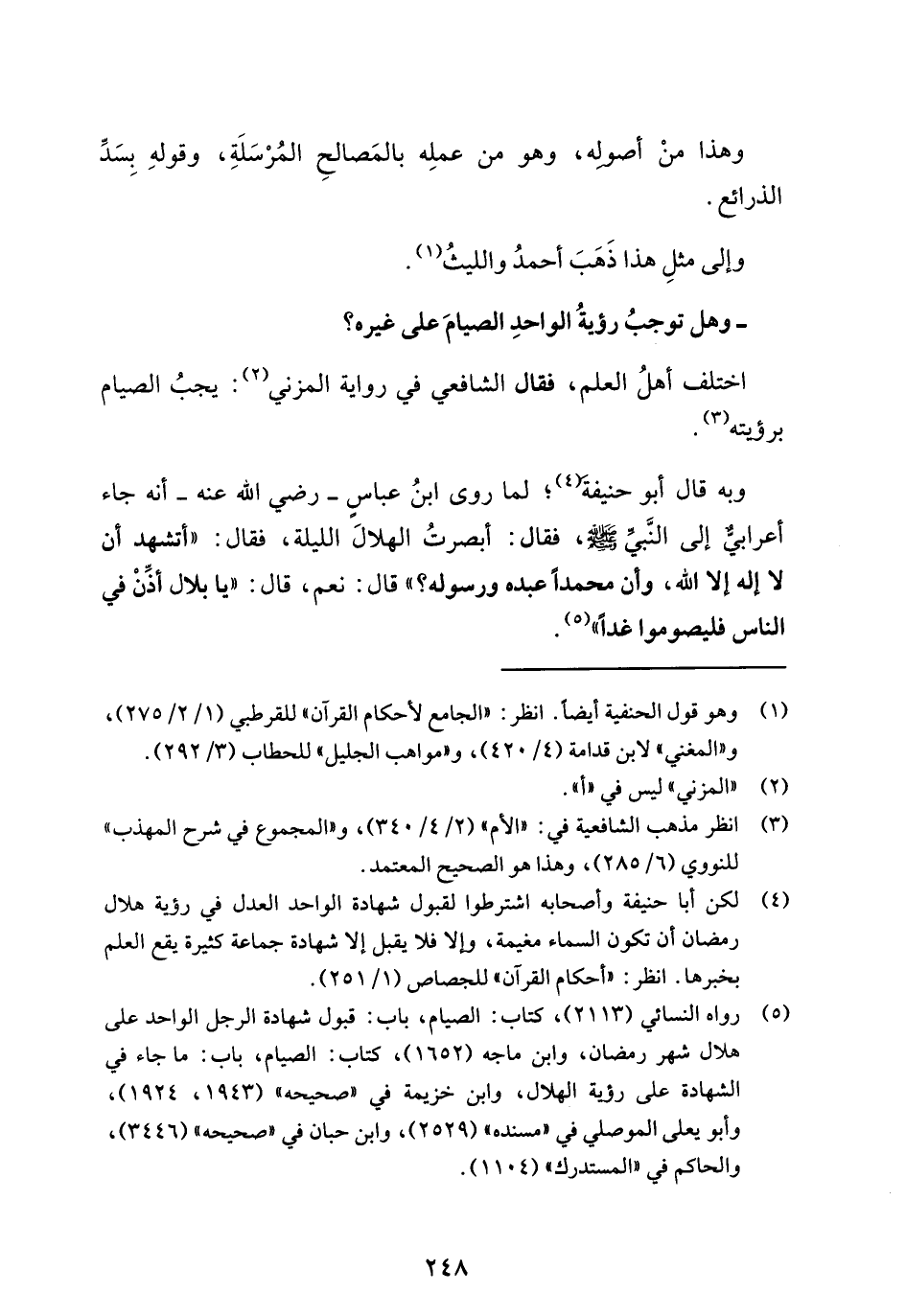 (¬4) لكن أبا حنيفة وأصحابه اشترطوا لقبول شهادة الواحد العدل في رؤية هلال رمضان أن تكون السماء مغيمة، وإلا فلا يقبل إلا شهادة جماعة كثيرة يقع العلم بخبرها. انظر: "أحكام القرآن" للجصاص (1/ 251).