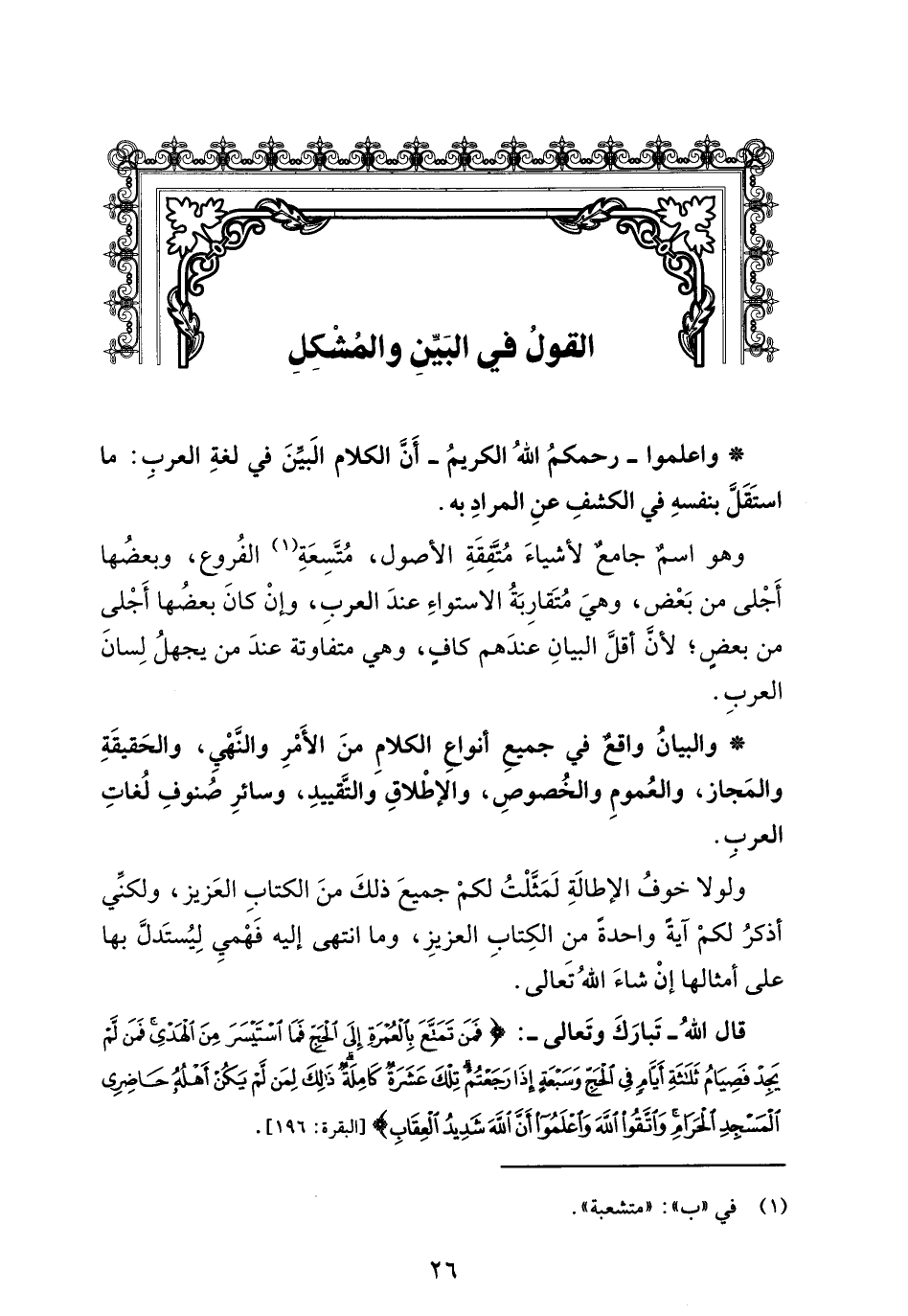 * واعلموا -رحمكمُ اللهُ الكريمُ- أَنَّ الكلام الَبيِّنَ في لغةِ العربِ: ما استَقَلَّ بنفسهِ في الكشفِ عنِ المرادِ به.