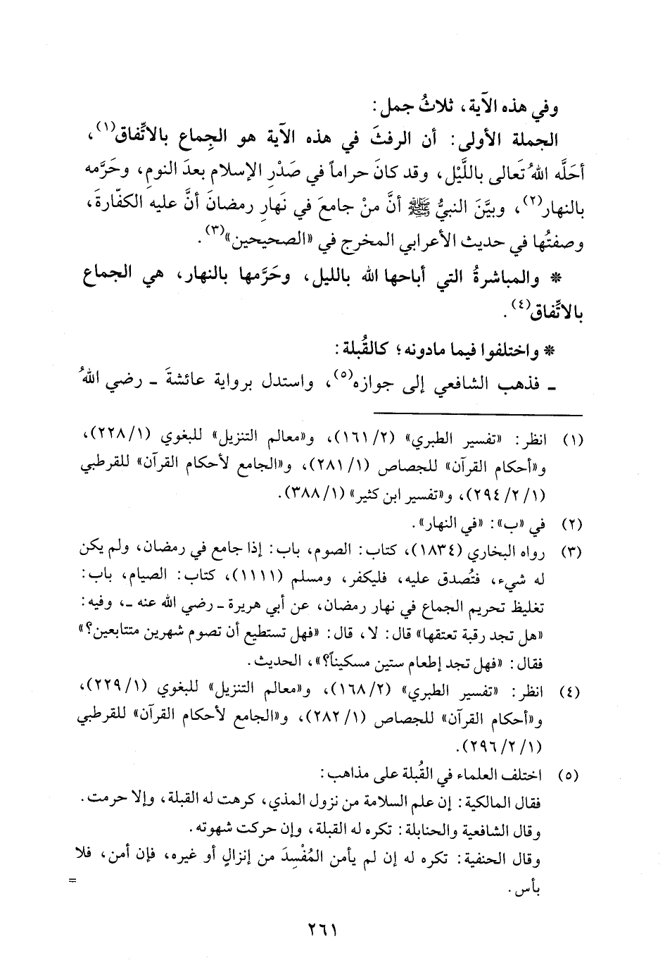 الجملة الأولى: أن الرفثَ في هذه الآية هو الجِماع بالاتِّفاق (¬1)، أحَلَّه اللهُ تَعالى باللَّيْل، وقد كانَ حرامًا في صَدْرِ الإسلام بعدَ النومِ، وحَرَّمه بالنهار (¬2)، وبيَّنَ النبيُّ - صلى الله عليه وسلم - أنَّ منْ جامعَ في نَهارِ رمضانَ أنَّ عليه الكفّارةَ، وصفتُها في حديث الأعرابي المخرج في "الصحيحين" (¬3).