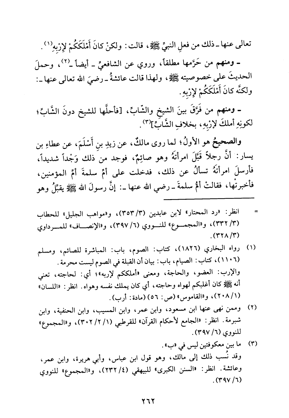 والصحيحُ هو الأولُ؛ لما روى مالكٌ، عن زيدِ بنِ أَسْلَمَ، عن عطاءِ بن يسار: أنَّ رجلًا قَبَّلَ امرأتَهُ وهو صائِم، فوجد من ذلك وَجْدًا شديدًا، فأرسلَ امرأتَهُ تسألُ عن ذلك، فدخلت على أمِّ سلمةَ أمِّ المؤمنين، فأخبرتْها، فقالتْ أمُّ سلمةَ -رضي الله عنها-: إنَّ رسولَ الله - صلى الله عليه وسلم - يقبِّلُ وهو