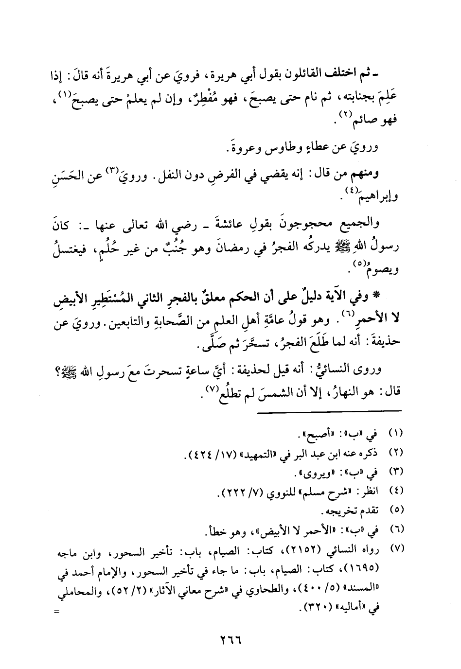 * وفي الآية دليلٌ على أن الحكم معلقٌ بالفجرِ الثاني المُسْتَطِيرِ الأبيضِ لا الأحمرِ (¬6). وهو قولُ عامَّةِ أهلِ العلمِ من الصَّحابةِ والتابعين. ورويَ عن حذيفةَ: أنه لما طَلَعَ الفجرُ، تسحَّرَ ثم صَلَّى.