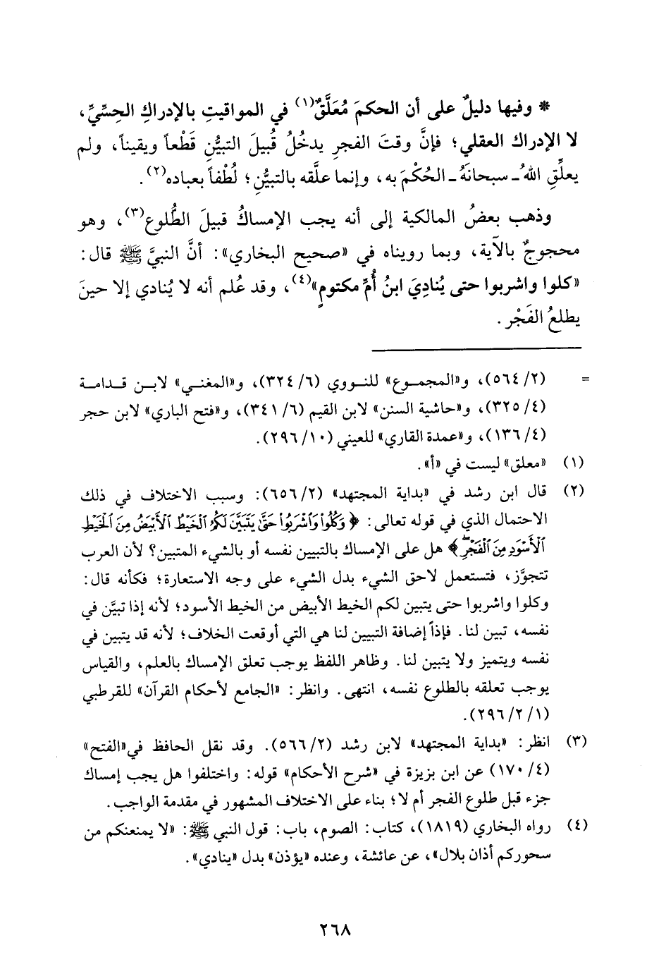(¬2) قال ابن رشد في "بداية المجتهد" (2/ 656): وسبب الاختلاف في ذلك الاحتمال الذي في قوله تعالى: {وَكُلُوا وَاشْرَبُوا حَتَّى يَتَبَيَّنَ لَكُمُ الْخَيْطُ الْأَبْيَضُ مِنَ الْخَيْطِ الْأَسْوَدِ مِنَ الْفَجْرِ} هل على الإمساك بالتبيين نفسه أو بالشيء المتبين؛ لأن العرب تتجوَّز، فتستعمل لاحق الشيء بدل الشيء على وجه الاستعارة؛ فكأنه قال: وكلوا واشربوا حتى يتبين لكم الخيط الأبيض من الخيط الأسود؛ لأنه إذا تبيَّن في نفسه، تبين لنا. فإذًا إضافة التبيين لنا هي التي أوقعت الخلاف؛ لأنه قد يتبين في نفسه ويتميز ولا يتبين لنا. وظاهر اللفظ يوجب تعلق الإمساك بالعلم، والقياس يوجب تعلقه بالطلوع نفسه، انتهى. وانظر: "الجامع لأحكام القرآن" للقرطبي (1/ 2/ 296).