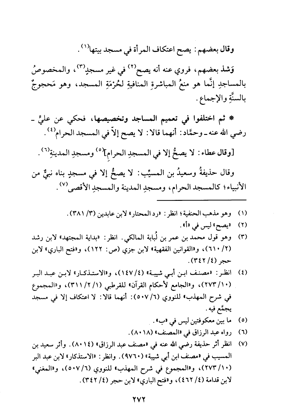 (¬4) انظر: "مصنف ابن أبي شيبة" (4/ 147)، و"الاستذكار" لابن عبد البر (10/ 273)، و"الجامع لأحكام القرآن" للقرطبي (1/ 2/ 311)، و"المجموع في شرح المهذب" للنووي (6/ 507): أنهما قالا: لا اعتكاف إلا في مسجد يجمَّع فيه.