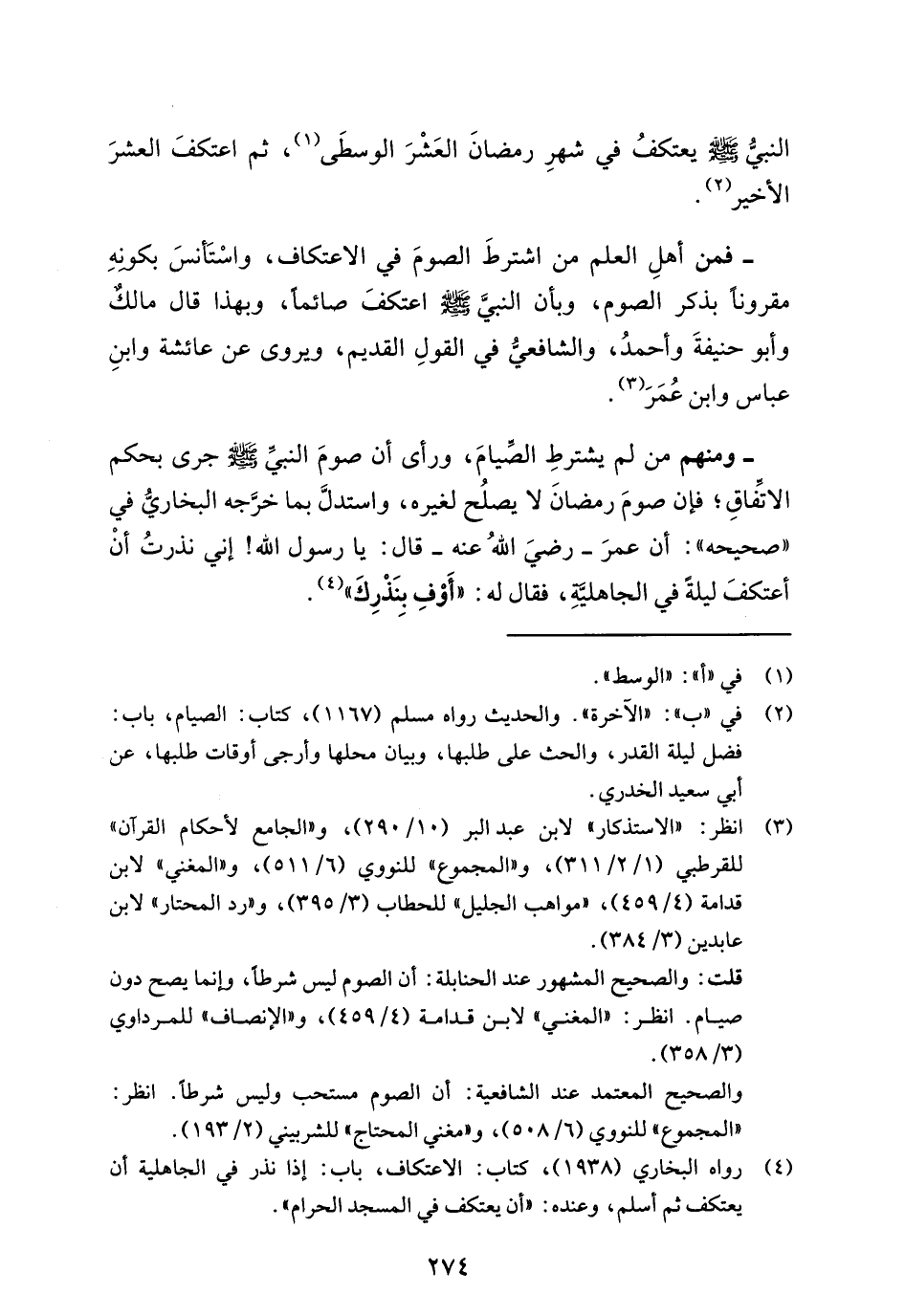 - ومنهم من لم يشترطِ الصِّيامَ، ورأى أن صومَ النبيِّ - صلى الله عليه وسلم - جرى بحكم الاتِّفاقِ؛ فإن صومَ رمضانَ لا يصلح لغيره، واستدلَّ بما خرَّجه البخاريُّ في "صحيحه": أن عمرَ -رضيَ اللهُ عنه- قال: يا رسول الله! إني نذرتُ أنْ أعتكفَ ليلةً في الجاهليَّةِ، فقال له: "أَوْفِ بِنَذْرِكَ" (¬4).