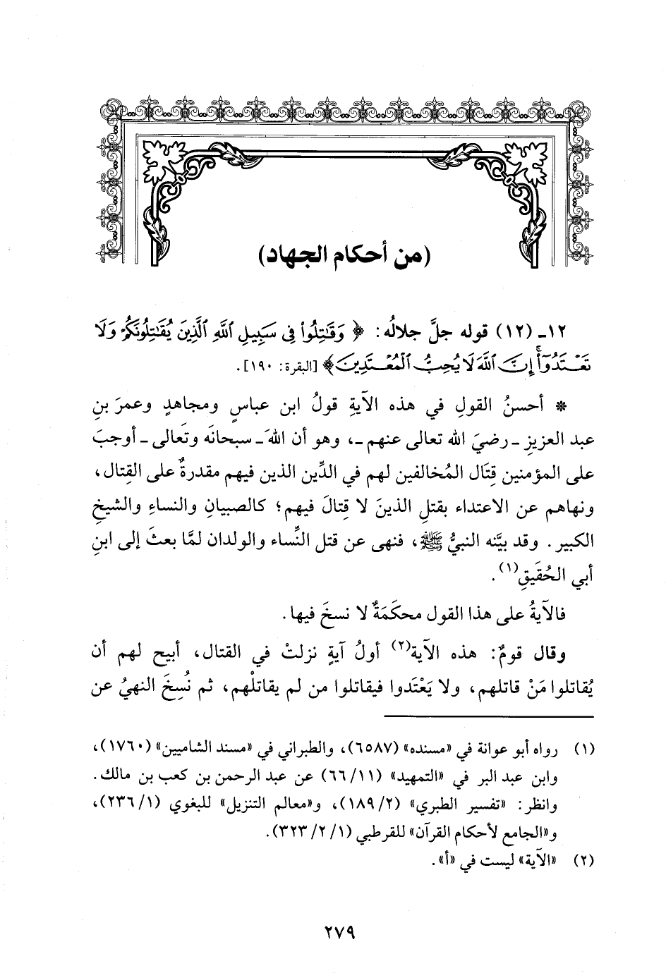 12 - (12) قوله جل جلالُه: {وَقَاتِلُوا فِي سَبِيلِ اللَّهِ الَّذِينَ يُقَاتِلُونَكُمْ وَلَا تَعْتَدُوا إِنَّ اللَّهَ لَا يُحِبُّ الْمُعْتَدِينَ} [البقرة: 190].