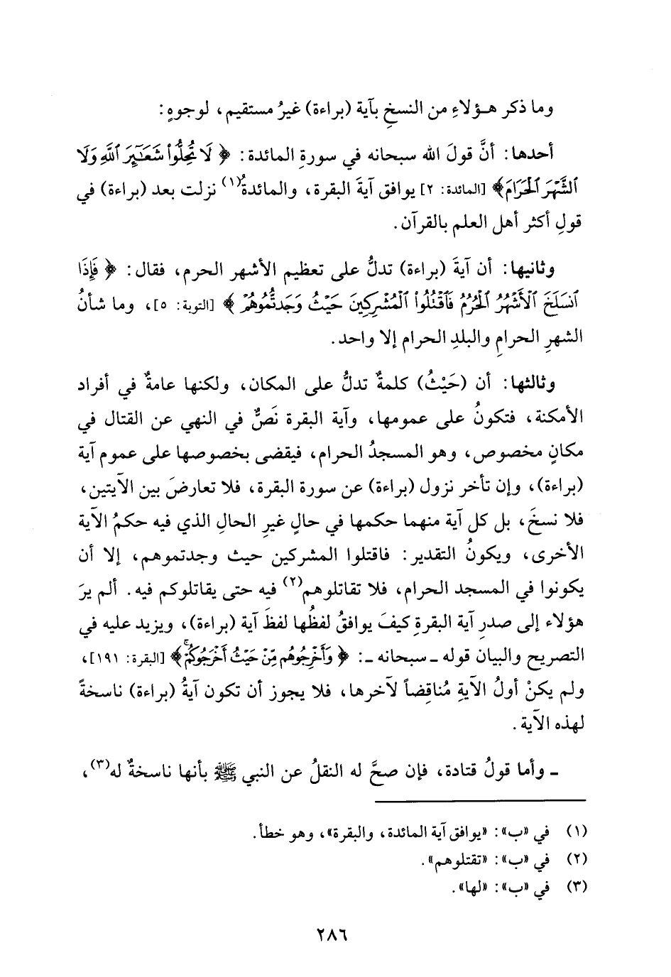 أحدها: أنَّ قولَ الله سبحانه في سورةِ المائدة: {لَا تُحِلُّوا شَعَائِرَ اللَّهِ وَلَا الشَّهْرَ الْحَرَامَ} [المائدة: 2] يوافق آيةَ البقرة، والمائدة (¬1) نزلت بعد (براءة) في قولِ أكثر أهل العلم بالقرآن.