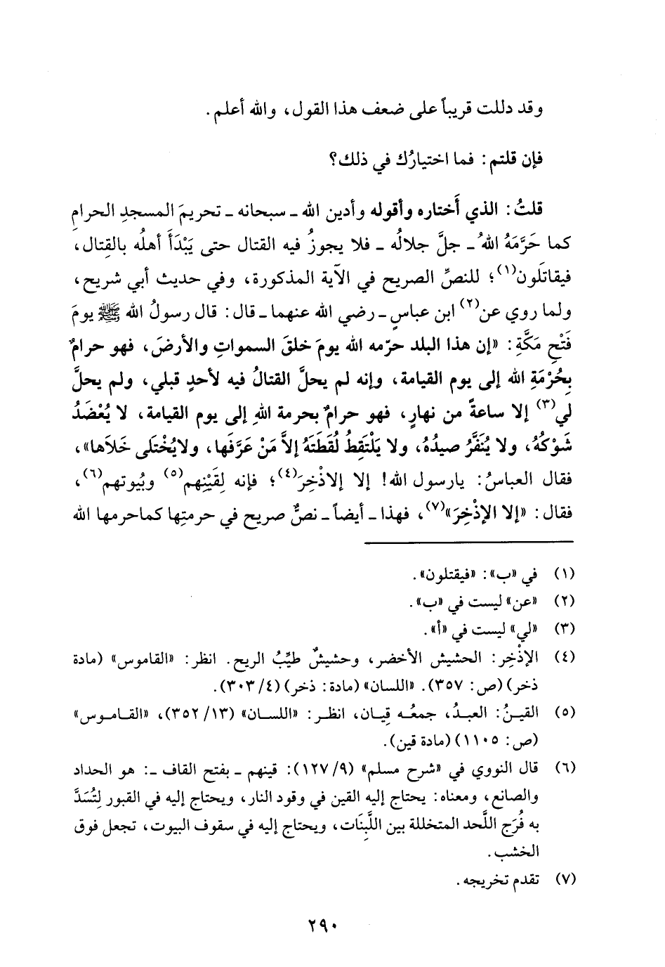 قلتُ: الذي أَختاره وأقوله وأدين الله -سبحانه- تحريمَ المسجدِ الحرامِ كما حَرَّمَهُ اللهُ -جل جلالُه- فلا يجوزُ فيه القتال حتى يَبْدَأَ أهلُه بالقِتال، فيقاتَلون (¬1)؛ للنصِّ الصريح في الآية المذكورة، وفي حديث أبي شريح، ولما روي عن (¬2) ابن عباسٍ -رضي الله عنهما- قال: قال رسولُ الله - صلى الله عليه وسلم - يومَ فَتْحِ مَكَةِ: "إن هذا البلد حرّمه الله يومَ خلقَ السمواتِ والأرضَ، فهو حرامٌ بحُرْمَةِ الله إلى يوم القيامة، وإنه لم يحل القتالُ فيه لأحدٍ قبلي، ولم يحلَّ لَي (¬3) إلا ساعةً من نهارٍ، فهو حرامٌ بحرمة اللهِ إلى يوم القيامة، لا يُعْضَدُ شَوْكُهُ، ولا يُنَفَّرُ صيدُهُ، ولا يَلْتَقِطُ لُقَطَتَهُ إلَّا مَنْ عَرَّفَها، ولا يُخْتَلى خَلاَها"، فقال العباسُ: يا رسول الله! إلا الإذْخِرَ (¬4)؛ فإنه لِقَيْنهم (¬5) وبُيوتهم (¬6)، فقال: "إلا الإذْخِرَ" (¬7)، فهذا -أيضًا- نصٌّ صريح في حرمتِها كما حرمها الله