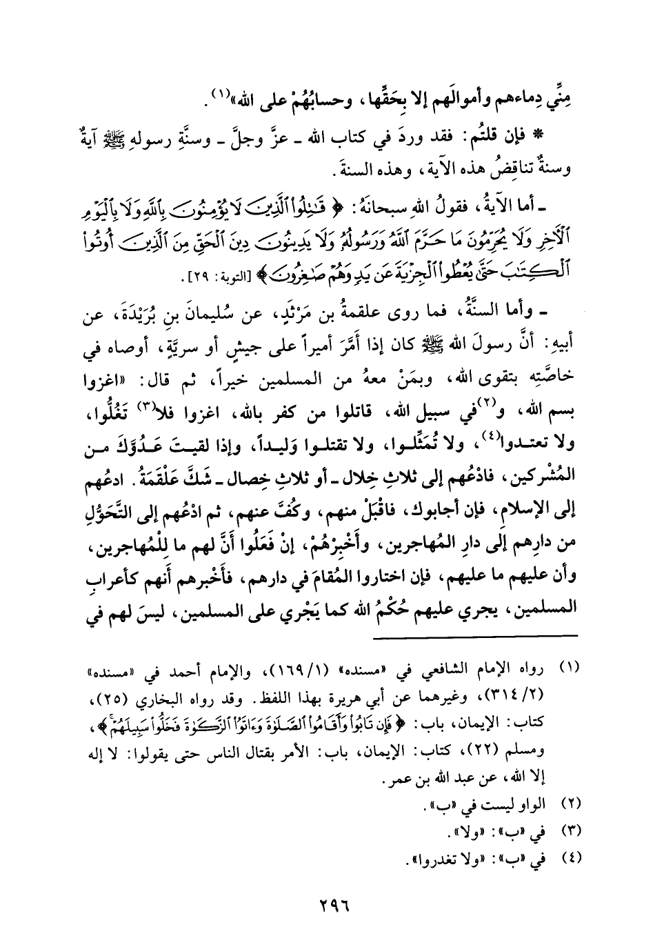 - وأما السنَّةُ، فما روى علقمةُ بن مَرْثَدٍ، عن سُليمانَ بنِ بُرَيْدَةَ، عن أبيهِ: أنَّ رسولَ الله - صلى الله عليه وسلم - كان إذا أَمَّرَ أميرًا على جيشٍ أو سريَّةٍ، أوصاه في خاصَّته بتقوى الله، وبمَنْ معهُ من المسلمين خيرًا، ثم قال: "اغزوا بسم الله، و (¬2) في سبيل الله، قاتلوا من كفر بالله، اغزوا فلا (¬3) تَغُلُّوا، ولا تعتدوا (¬4)، ولا تُمَثِّلوا، ولا تقتلوا وَليدًا، وإذا لقيتَ عَدُوَّكَ من المُشْركين، فادْعُهم إلى ثلاثِ خِلال -أو ثلاثِ خِصال- شَك عَلْقَمَةُ. ادعُهم إلى الإسلامِ، فإن أجابوك، فاقْبَلْ منهم، وكُفَّ عنهم، ثم ادْعُهم إلى التَّحَوّلِ من دارِهم إلى دارِ المُهاجرين، وأَخْبِرْهُمْ، إنْ فَعَلُوا أَنَّ لهم ما لِلْمُهاجرين، وأن عليهم ما عليهم، فإن اختاروا المُقامَ في دارهم، فأَخْبرهم أَنهم كأعرابِ المسلمين، يجري عليهم حُكْمُ الله كما يَجْري على المسلمين، ليسَ لهم في