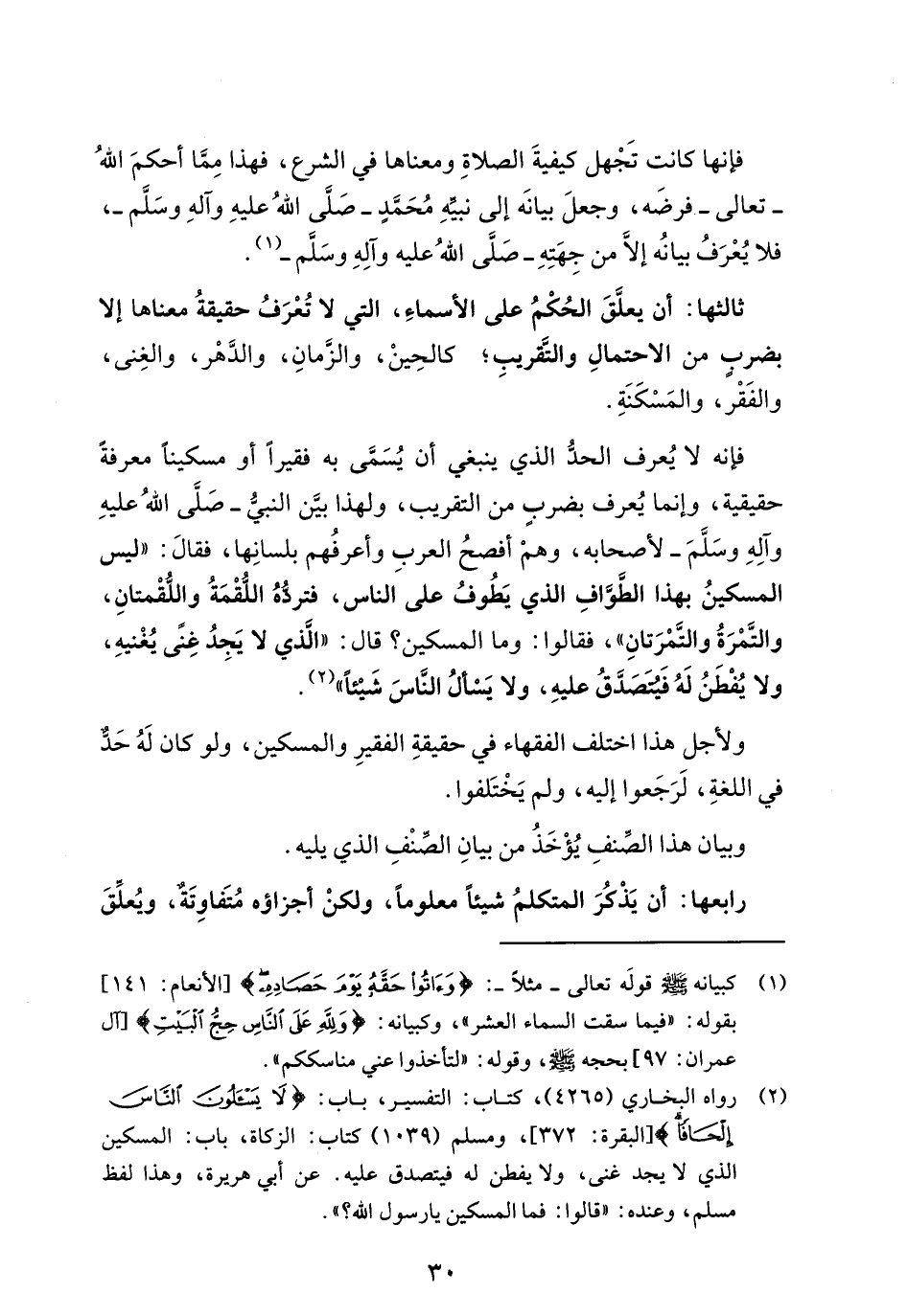 فإنه لا يُعرف الحدُّ الذي ينبغي أن يُسَمَّى به فقيراً أو مسكيناً معرفةً حقيقية، وإنما يُعرف بضربٍ من التقريب، ولهذا بيَّن النبيُّ -صَلَّى اللهُ عليهِ وآلِهِ وسَلَّمَ- لأصحابه، وهمْ أفصحُ العربِ وأعرفُهم بلسانِها، فقالَ: "ليس المسكينُ بهذا الطَّوَّافِ الذي يَطُوفُ على الناس، فتردُّهُ اللُّقْمَةُ واللُّقْمتانِ، والتَّمْرَةُ والتَّمْرَتانِ"، فقالوا: وما المسكين؟ قال: "الَّذي لا يَجِدُ غِنًى يُغْنيهِ، ولا يُفْطَنُ لَهُ فَيُتَصَدَّقُ عليهِ، ولا يَسْألُ النَّاسَ شَيْئاً" (¬2).