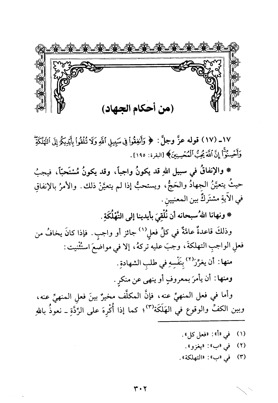 17 - (17) قوله عزَّ وجل: {وَأَنْفِقُوا فِي سَبِيلِ اللَّهِ وَلَا تُلْقُوا بِأَيْدِيكُمْ إِلَى التَّهْلُكَةِ وَأَحْسِنُوا إِنَّ اللَّهَ يُحِبُّ الْمُحْسِنِينَ} [البقرة: 195].