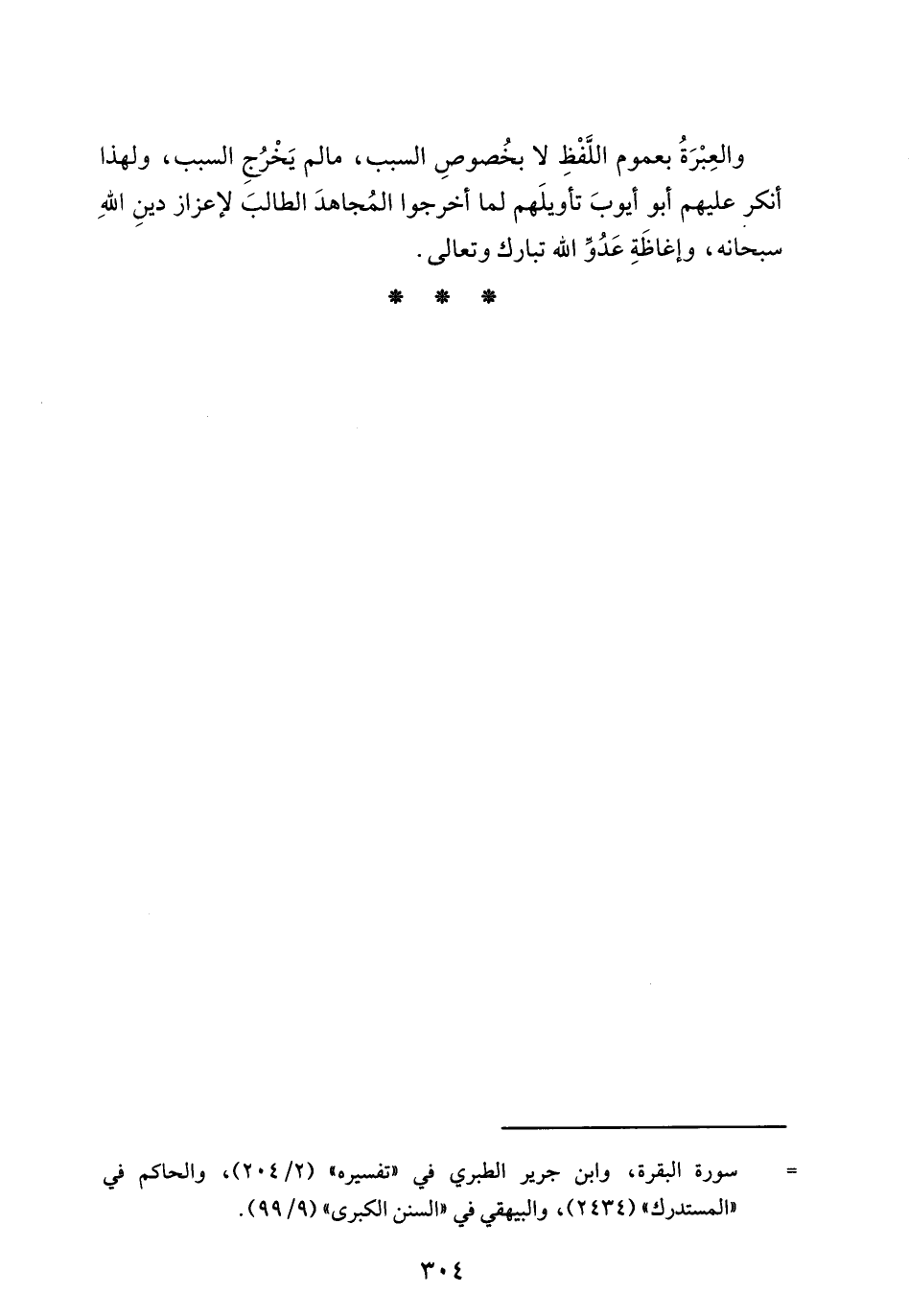والعِبْرَةُ بعموم اللَّفْظِ لا بخُصوصِ السبب، ما لم يَخْرُجِ السبب، ولهذا أنكر عليهم أبو أيوبَ تأويلَهم لما أخرجوا المُجاهدَ الطالبَ لإعزاز دينِ اللهِ سبحانه، وإغاظَةِ عَدُوِّ الله تبارك وتعالى.