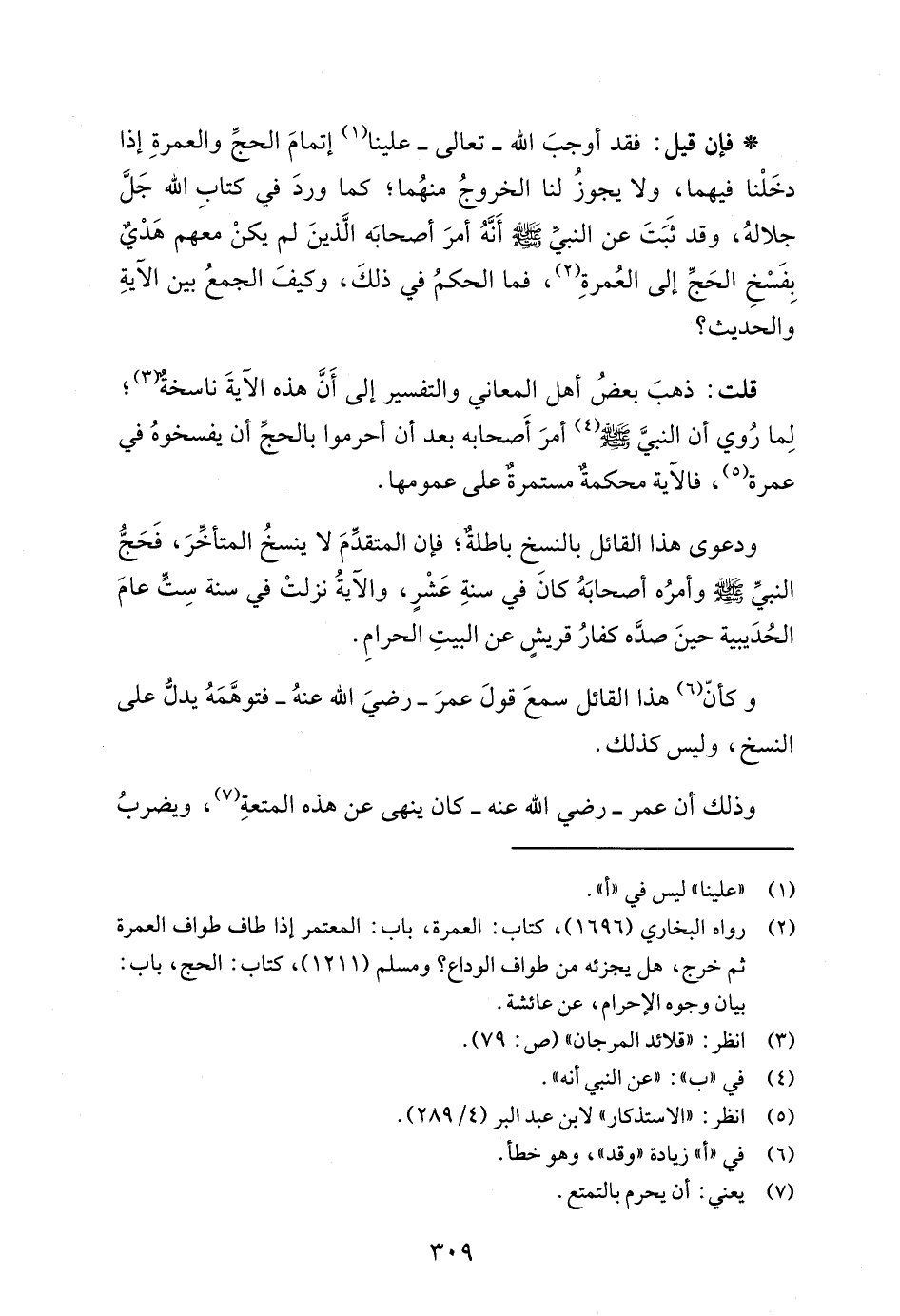ودعوى هذا القائل بالنسِخ باطلةٌ؛ فإن المتقدِّمَ لا ينسخُ المتأخِّرَ، فَحَجُّ النبيِّ - صلى الله عليه وسلم - وأمرُه أصحابَهُ كان في سنةِ عَشْرٍ، والآيةُ نزلتْ في سنة سِتٍّ عامَ الحُدَيبية حينَ صدَّه كفارُ قريشٍ عن البيتِ الحرامِ.