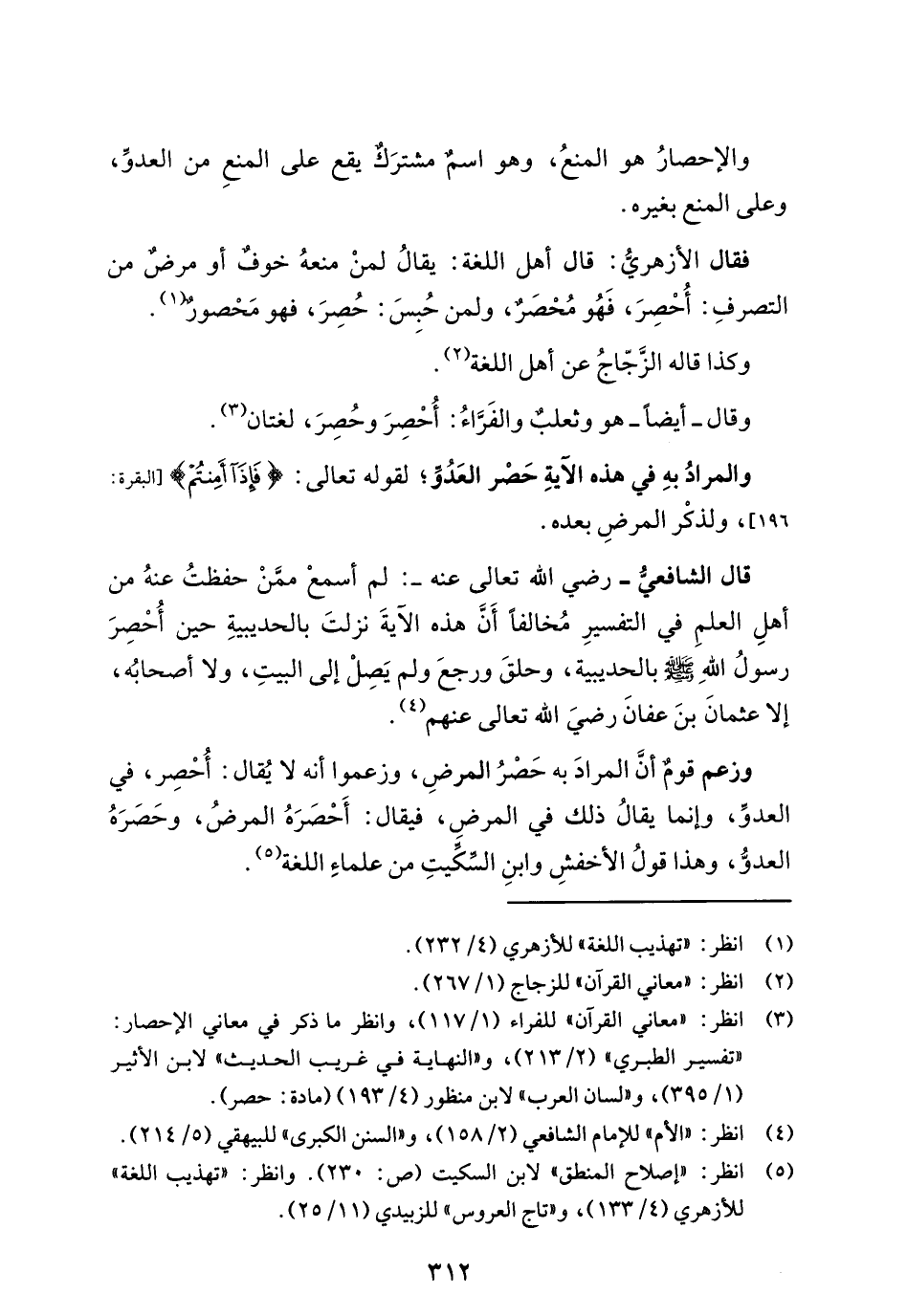 وزعم قومٌ أنَّ المرادَ به حَصْرُ المرضِ، وزعموا أنه لا يُقال: أُحْصِر، في العدوِّ، وإنما يقالُ ذلك في المرضِ، فيقال: أَحْصَرَهُ المرضُ، وحَصَرَهُ العدوُّ، وهذا قولُ الأخفشِ وابنِ السِّكِّيتِ من علماءِ اللغة (¬5).