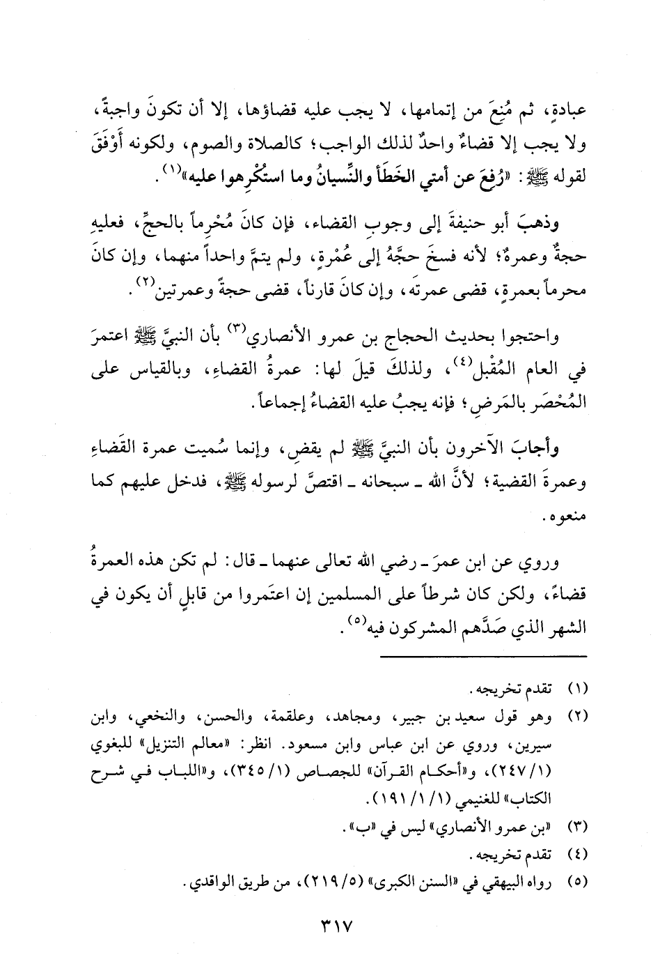 وأجابَ الآخرون بأن النبيَّ - صلى الله عليه وسلم - لم يقضِ، وإنما سُميت عمرة القَضاءِ وعمرةَ القضية؛ لأنَّ الله - سبحانه - اقتصَّ لرسوله - صلى الله عليه وسلم -، فدخل عليهم كما منعوه.