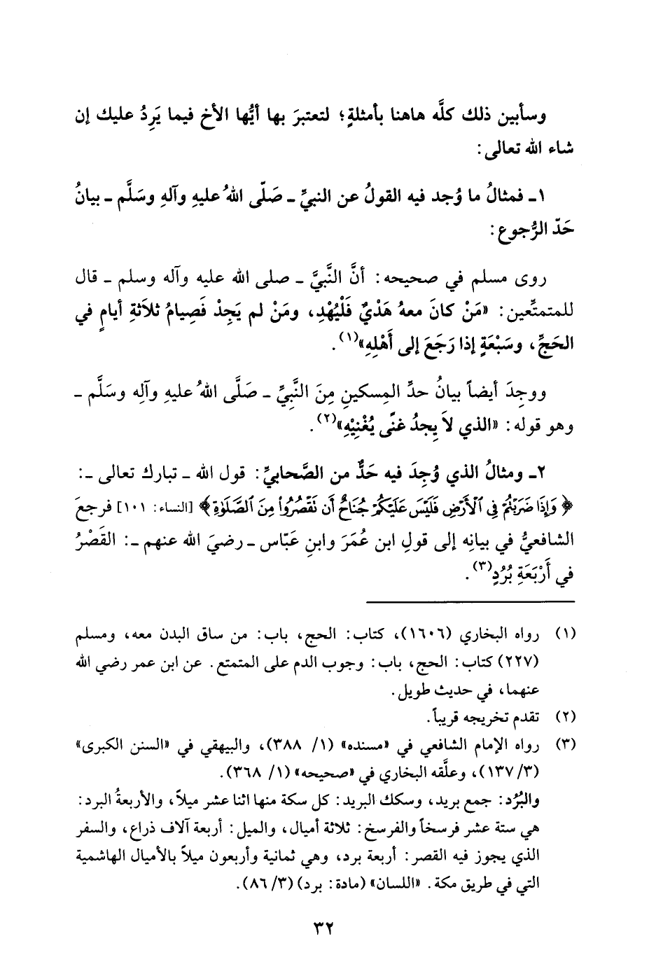 2 - ومثالُ الذي وُجِدَ فيه حَدٌّ من الصَّحابيِّ: قول الله -تبارك تعالى-: {وَإِذَا ضَرَبْتُمْ فِي الْأَرْضِ فَلَيْسَ عَلَيْكُمْ جُنَاحٌ أَنْ تَقْصُرُوا مِنَ الصَّلَاةِ} [النساء: 101] فرجعَ الشافعيُّ في بيانِه إلى قولِ ابن عُمَرَ وابنِ عَبّاس -رضيَ الله عنهم-: القَصْرُ في أَرْبَعَةِ بُرُدٍ (¬3).