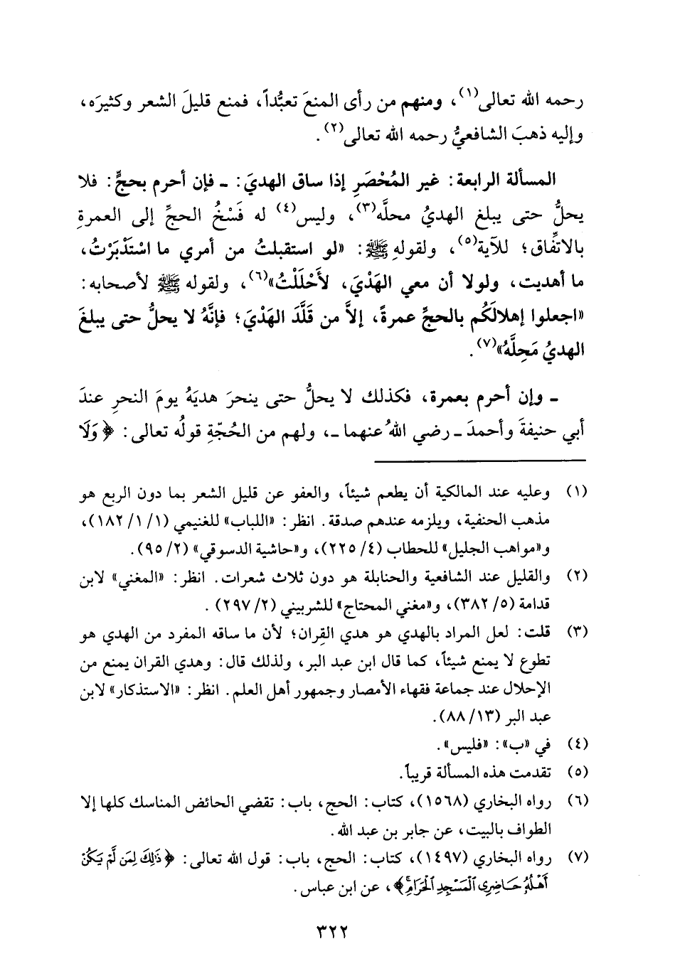 (¬3) قلت: لعل المراد بالهدي هو هدي القِران؛ لأن ما ساقه المفرد من الهدي هو تطوع لا يمنع شيئاً، كما قال ابن عبد البر، ولذلك قال: وهدي القران يمنع من الإحلال عند جماعة فقهاء الأمصار وجمهور أهل العلم. انظر: "الاستذكار" لابن عبد البر (13/ 88).