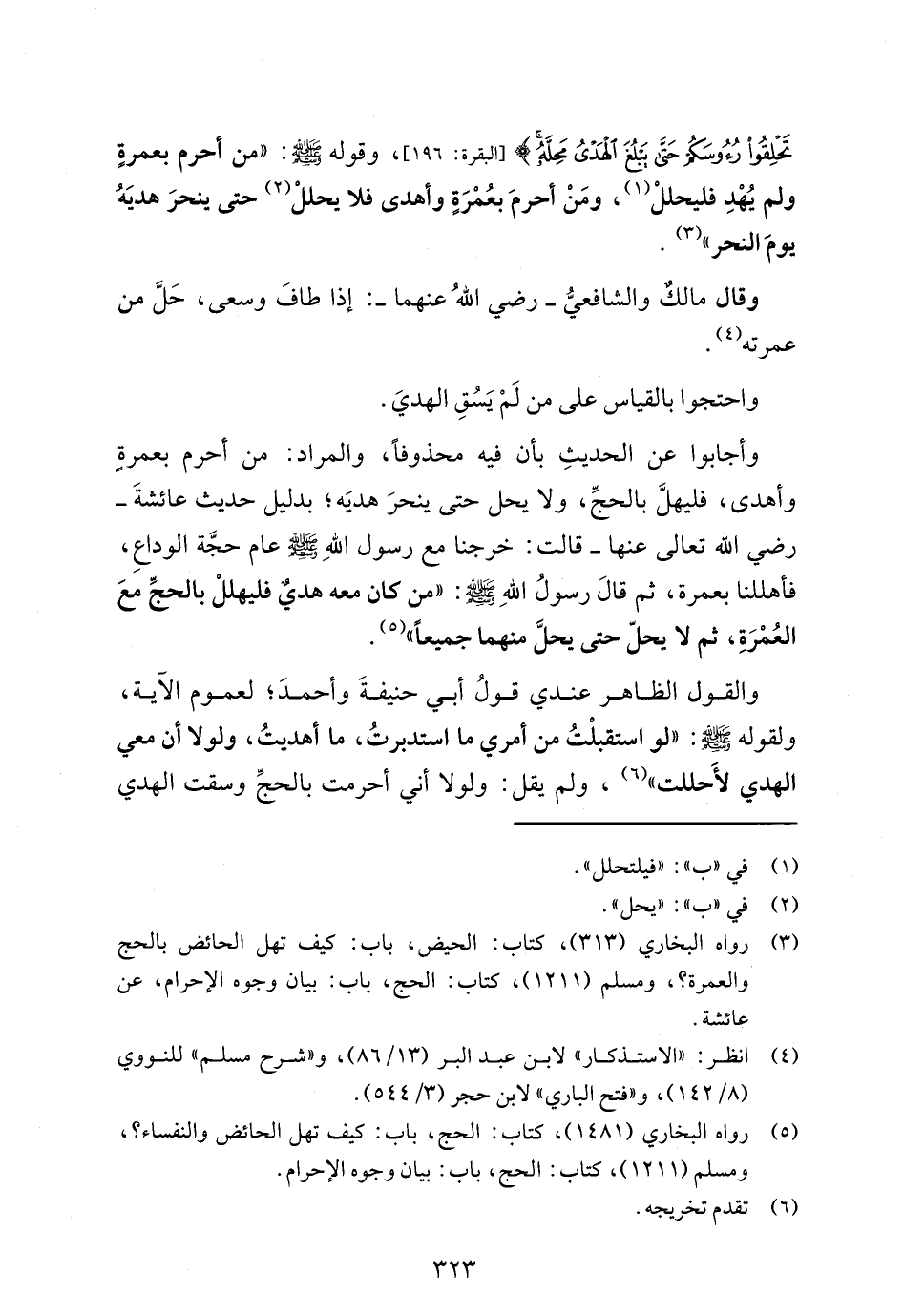 تَحْلِقُوا رُءُوسَكُمْ حَتَّى يَبْلُغَ الْهَدْيُ مَحِلَّهُ} [البقرة: 196]، وقوله - صلى الله عليه وسلم -: "من أحرم بعمرةٍ ولم يُهْدِ فليحللْ (¬1)، ومَنْ أحرمَ بعُمْرَةٍ وأهدى فلا يحللْ (¬2) حتى ينحرَ هديَهُ يومَ النحر" (¬3).
