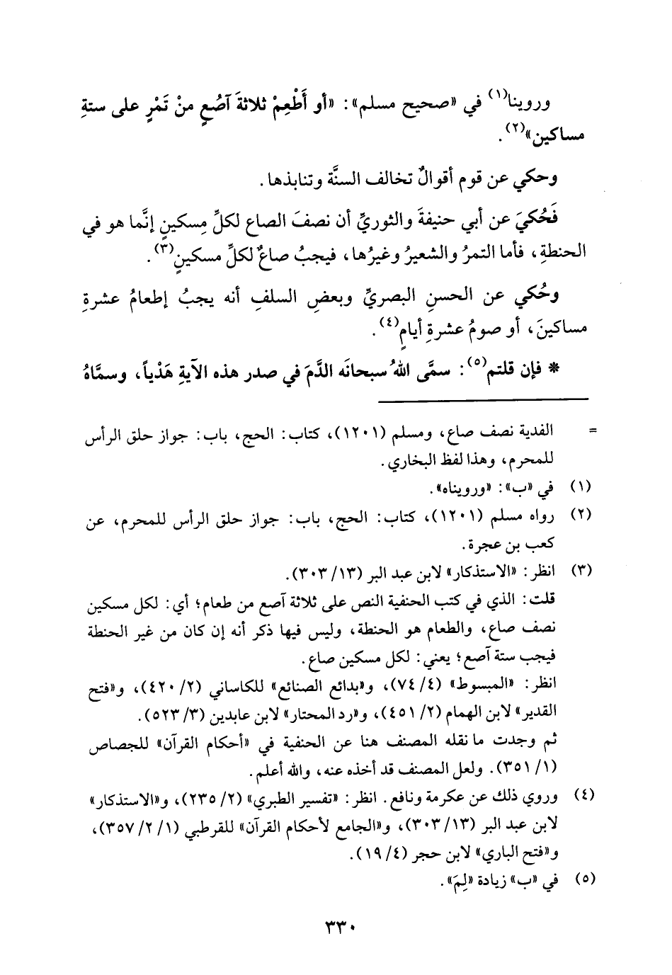 فَحُكيَ عن أبي حنيفةَ والثوريِّ أن نصفَ الصاع لكلِّ مِسكينٍ إنَّما هو في الحنطةِ، فأما التمرُ والشعيرُ وغيرُها، فيجبُ صاعٌ لكلِّ مسكينٍ (¬3).