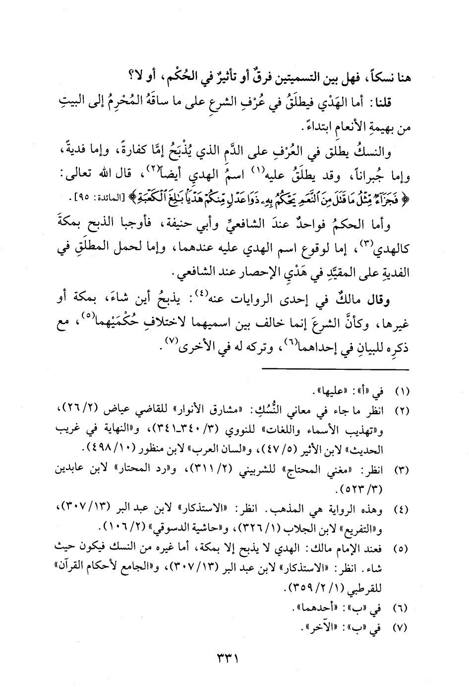 (¬5) فعند الإمام مالك: الهدي لا يذبح إلا بمكة، أما غيره من النسك فيكون حيث شاء. انظر: "الاستذكار" لابن عبد البر (13/ 307)، و "الجامع لأحكام القرآن" للقرطبي (1/ 2/ 359).