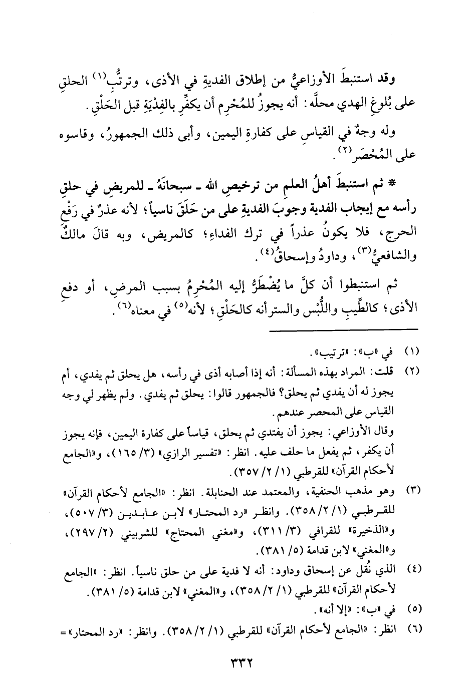 * ثم استنبطَ أهلُ العلمِ من ترخيصِ الله -سبحانَهُ - للمريضِ في حلقِ رأسه مع إيجاب الفدية وجوبَ الفديةِ على من حَلَقَ ناسياً؛ لأنه عذز في رَفْع الحرج، فلا يكونُ عذراً في ترك الفداءِ؛ كالمريض، وبه قالَ مالكٌ والشافعيُّ (¬3)، وداودُ وإسحاقُ (¬4).