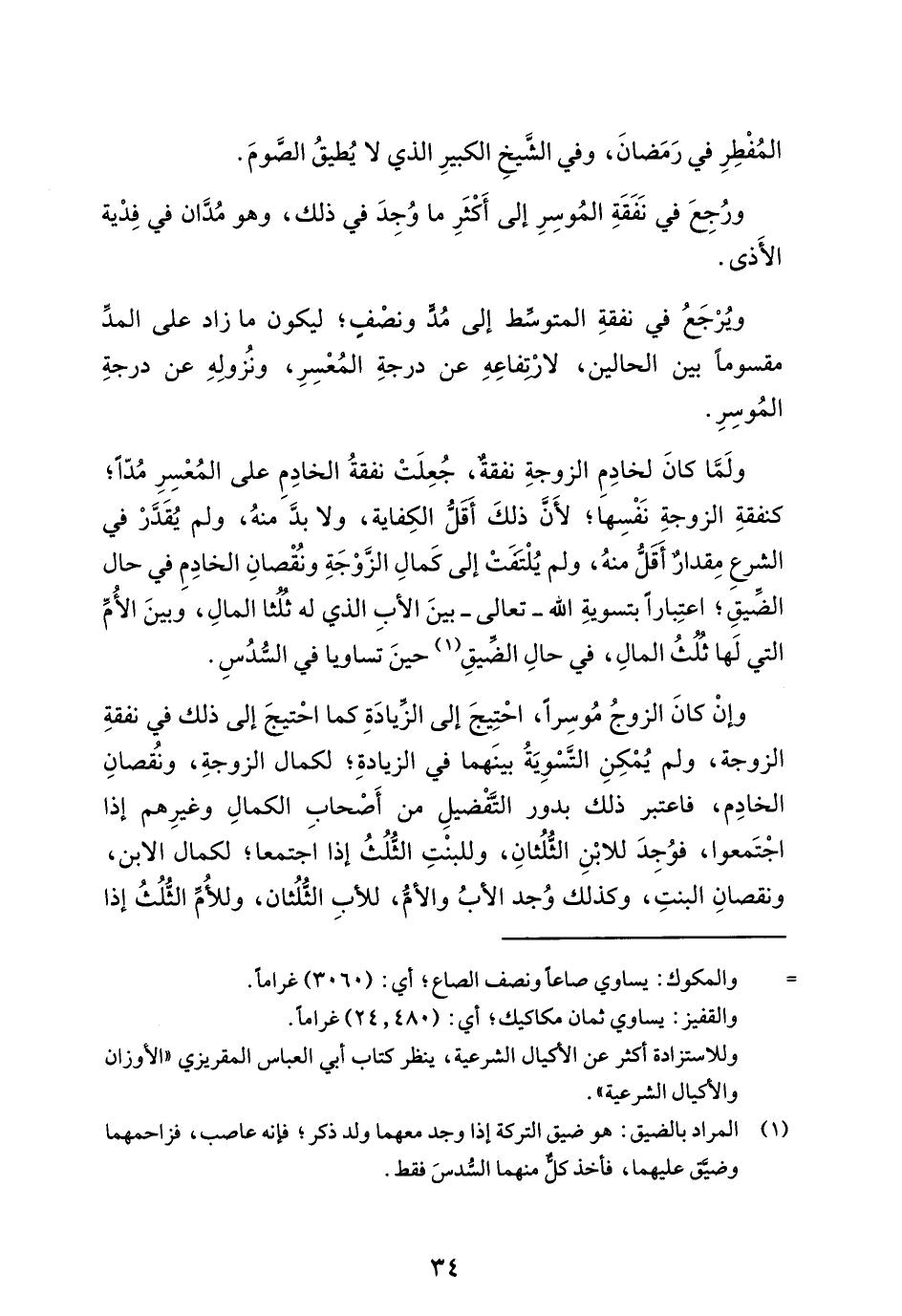 ولَمَّا كانَ لخادِمِ الزوجةِ نفقةٌ، جُعِلَتْ نفقةُ الخادِمِ على المُعْسِرِ مُدًّا؛ كنفقةِ الزوجةِ نَفْسِها؛ لأَنَّ ذلكَ أَقَلُّ الكِفاية، ولا بدَّ منهُ، ولم يُقَدَّرْ في الشرعِ مِقدارٌ أَقَلُّ منهُ، ولم يُلْتَفَتْ إلى كَمالِ الزَّوْجَةِ ونُقْصانِ الخادِمِ في حال الضِّيقِ؛ اعتِباراً بتسويةِ الله -تعالى- بينَ الأبِ الذي له ثُلُثا المالِ، وبينَ الأُمِّ التي لَها ثُلُثُ المالِ، في حالِ الضِّيقِ (¬1) حينَ تساويا في السُّدُسِ.
