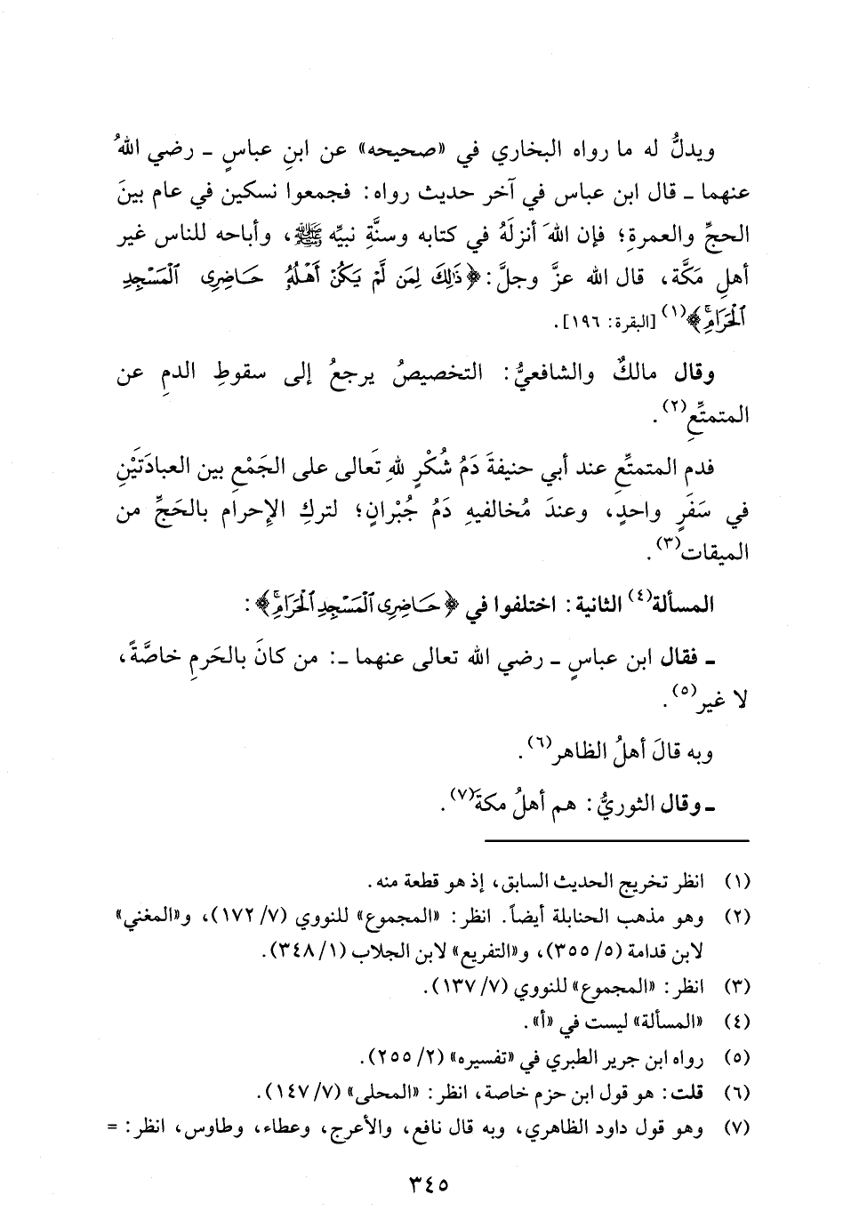 ويدلُّ له ما رواه البخاري في "صحيحه" عن ابنِ عباسٍ -رضي اللهُ عنهما - قال ابن عباس في آخر حديث رواه: فجمعوا نسكين في عام بينَ الحجِّ والعمرةِ؛ فإن اللهَ أنزلَهُ في كتابه وسنَّةِ نبيِّه - صلى الله عليه وسلم -، وأباحه للناس غير أهلِ مَكَّة، قال الله عزَّ وجلَّ: {ذَلِكَ لِمَنْ لَمْ يَكُنْ أَهْلُهُ حَاضِرِي الْمَسْجِدِ الْحَرَامِ} (¬1) [البقرة: 196].