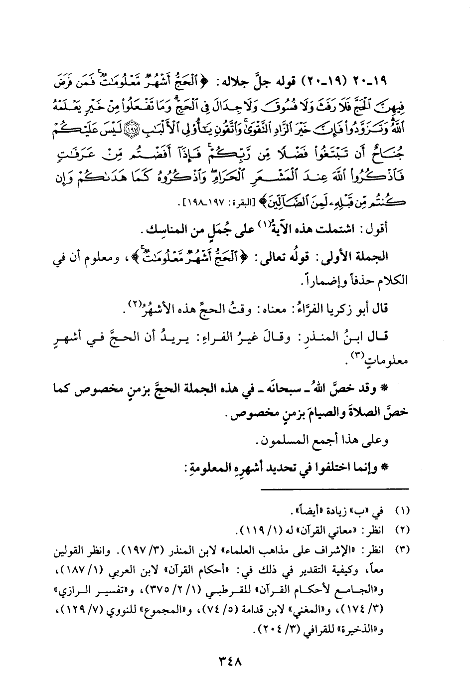 19 - 20 (19 - 20) قوله جلَّ جلاله: {الْحَجُّ أَشْهُرٌ مَعْلُومَاتٌ فَمَنْ فَرَضَ فِيهِنَّ الْحَجَّ فَلَا رَفَثَ وَلَا فُسُوقَ وَلَا جِدَالَ فِي الْحَجِّ وَمَا تَفْعَلُوا مِنْ خَيْرٍ يَعْلَمْهُ اللَّهُ وَتَزَوَّدُوا فَإِنَّ خَيْرَ الزَّادِ التَّقْوَى وَاتَّقُونِ يَاأُولِي الْأَلْبَابِ (197) لَيْسَ عَلَيْكُمْ جُنَاحٌ أَنْ تَبْتَغُوا فَضْلًا مِنْ رَبِّكُمْ فَإِذَا أَفَضْتُمْ مِنْ عَرَفَاتٍ فَاذْكُرُوا اللَّهَ عِنْدَ الْمَشْعَرِ الْحَرَامِ وَاذْكُرُوهُ كَمَا هَدَاكُمْ وَإِنْ كُنْتُمْ مِنْ قَبْلِهِ لَمِنَ الضَّالِّينَ} [البقرة: 197 - 198].