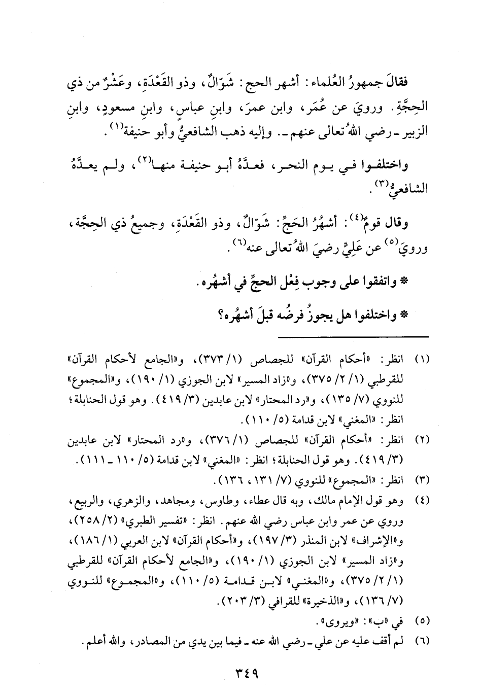 فقالَ جمهورُ العُلماء: أشهر الحج: شَوّالٌ، وذو القَعْدَةِ، وعَشْرٌ من ذي الحِجَّةِ. ورويَ عن عُمَر، وابن عمرَ، وابنِ عباسٍ، وابنِ مسعودٍ، وابنِ الزبير -رضي اللهُ تعالى عنهم -. وإليه ذهب الشافعيُّ وأبو حنيفة (¬1).