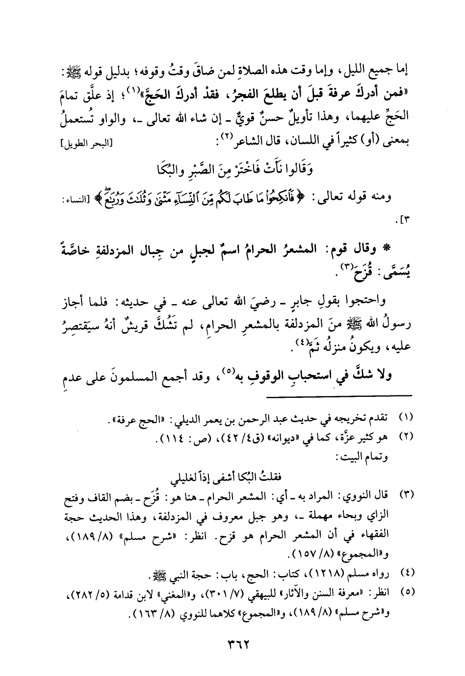 واحتجوا بقولِ جابر -رضيَ الله تعالى عنه- في حديثه: فلما أجاز رسولُ الله - صلى الله عليه وسلم - منَ المزدلفة بالمشعرِ الحرام، لم تشُكَّ قريشٌ أنهُ سيَقتصرُ عليه، ويكونُ منزلُه ثَم (¬4).