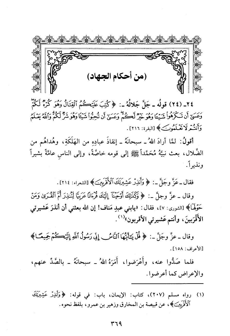 24 - (24) قولُه -جَلَّ جَلالُهُ-: {كُتِبَ عَلَيْكُمُ الْقِتَالُ وَهُوَ كُرْهٌ لَكُمْ وَعَسَى أَنْ تَكْرَهُوا شَيْئًا وَهُوَ خَيْرٌ لَكُمْ وَعَسَى أَنْ تُحِبُّوا شَيْئًا وَهُوَ شَرٌّ لَكُمْ وَاللَّهُ يَعْلَمُ وَأَنْتُمْ لَا تَعْلَمُونَ} البقر ة: 216].