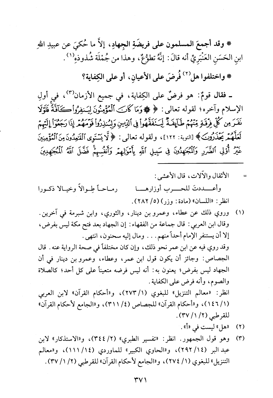 - فقال قومٌ: هو فرض على الكِفاية، في جميع الأزمان (¬3)، في أولِ الإسلام وآخره؛ لقوله تعالى: {وَمَا كَانَ الْمُؤْمِنُونَ لِيَنْفِرُوا كَافَّةً فَلَوْلَا نَفَرَ مِنْ كُلِّ فِرْقَةٍ مِنْهُمْ طَائِفَةٌ لِيَتَفَقَّهُوا فِي الدِّينِ وَلِيُنْذِرُوا قَوْمَهُمْ إِذَا رَجَعُوا إِلَيْهِمْ لَعَلَّهُمْ يَحْذَرُونَ} [التوبة: 122]، ولقوله تعالى: {لَا يَسْتَوِي الْقَاعِدُونَ مِنَ الْمُؤْمِنِينَ غَيْرُ أُولِي الضَّرَرِ وَالْمُجَاهِدُونَ فِي سَبِيلِ اللَّهِ بِأَمْوَالِهِمْ وَأَنْفُسِهِمْ فَضَّلَ اللَّهُ الْمُجَاهِدِينَ} [النساء: 95]