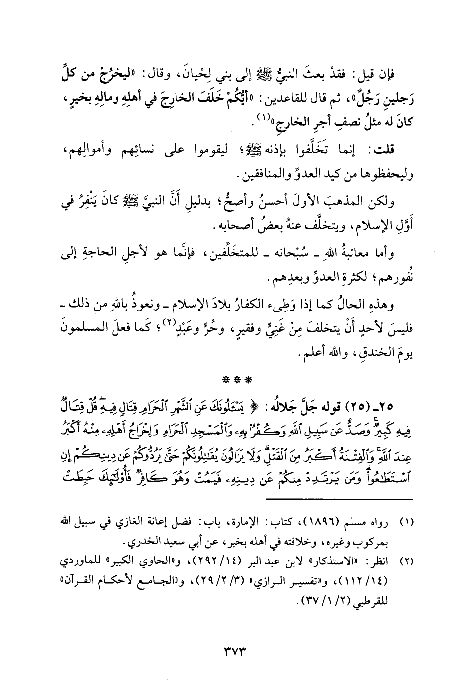 فإن قيل: فقدْ بعثَ النبيُّ -صلى الله عليه وسلم- إلى بني لِحْيانَ، وقال: "ليخرُجْ من كلِّ رَجلينِ رَجُلٌ"، ثم قال للقاعدين: "أيُّكمْ خَلَفَ الخارِجَ في أهلِهِ ومالِهِ بخيرٍ، كانَ له مثلُ نصفِ أجرِ الخارجِ" (¬1).
