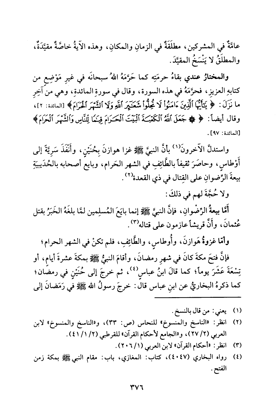 والمختارُ عندي بقاءُ حرمَتِه كما حَرمَهُ اللهُ سبحانَه في غيرِ مَوْضِع من كتابهِ العزيزِ، فحرَّمَهُ في هذه السورة، وقال في سورةِ المائدةِ، وهي من آخِرِ ما نَزَلَ: {يَاأَيُّهَا الَّذِينَ آمَنُوا لَا تُحِلُّوا شَعَائِرَ اللَّهِ وَلَا الشَّهْرَ الْحَرَامَ} [المائدة: 2]، وقال أيضاً: {جَعَلَ اللَّهُ الْكَعْبَةَ الْبَيْتَ الْحَرَامَ قِيَامًا لِلنَّاسِ وَالشَّهْرَ الْحَرَامَ} [المائدة: 97].
