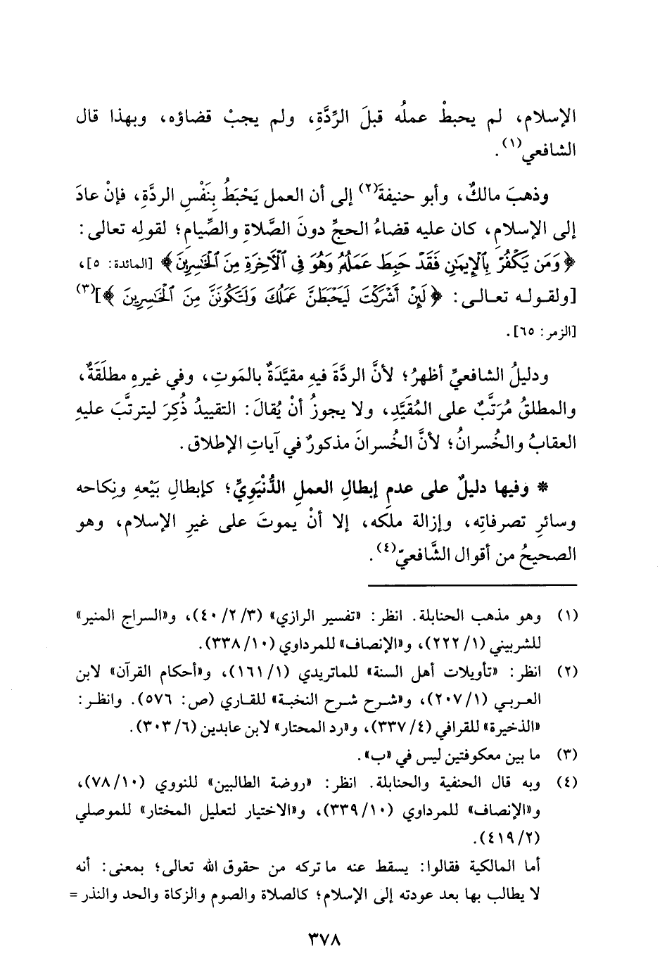 ودليلُ الشافعيِّ أظهرُ؛ لأنَّ الردَّةَ فيهِ مقيدَة بالمَوتِ، وفي غيرهِ مطلَقَةٌ، والمطلقُ مُرَتَّب على المُقَيَّدِ، ولا يجوزُ أنْ يُقالَ: التقييدُ ذُكِرَ ليترتَّبَ عليهِ العقابُ والخُسرانُ؛ لأنَّ الخُسرانَ مذكور في آياتِ الإطلاق.