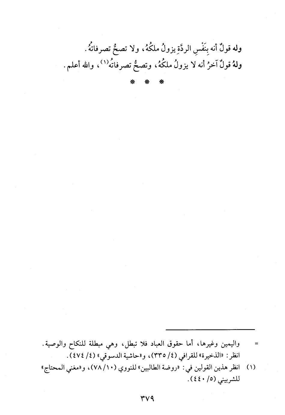 وله قولٌ أنه بِنَفْسِ الردَّة يزولُ ملكُهُ، ولا تصحُّ تصرفاتُهُ.