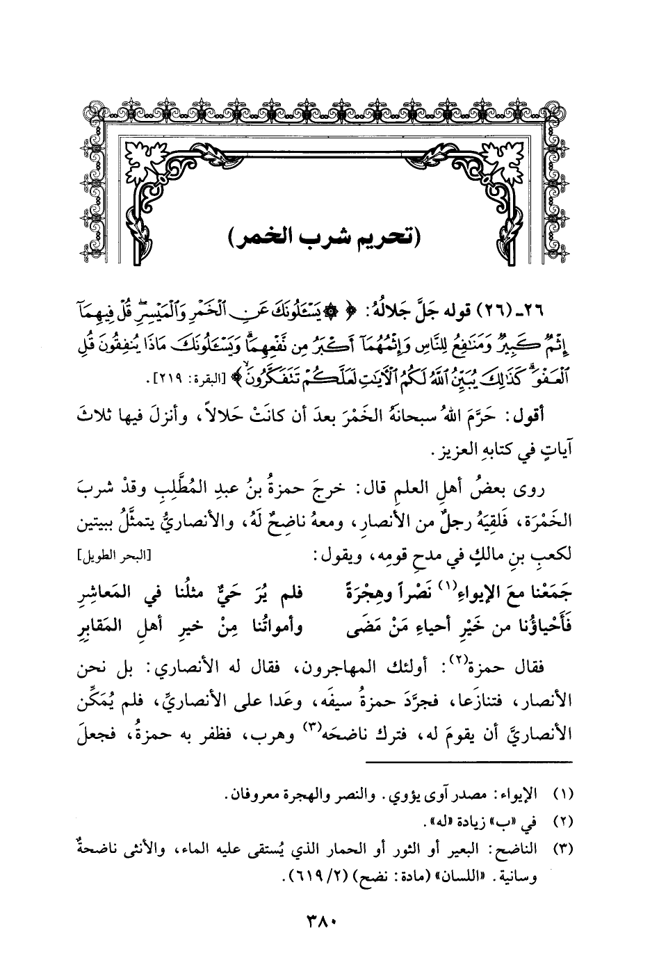 روى بعضُ أهلِ العلمِ قال: خرجَ حمزةُ بنُ عبدِ المُطَّلِبِ وقدْ شربَ الخَمْرَة، فَلقِيَهُ رجلٌ من الأنصارِ، ومعهُ ناضِحٌ لَهُ، والأنصاريُّ يتمثَّلُ ببيتين لكعبِ بنِ مالكٍ في مدحِ قومِه، ويقول: [البحر الطويل]