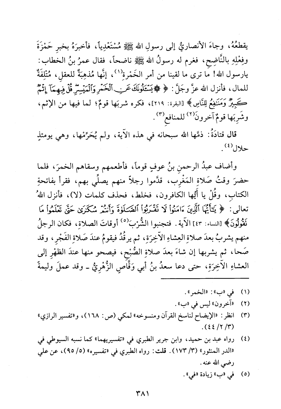 وأضاف عبدُ الرحمنِ بنُ عوفٍ قوماً، فأطعمهم وسقاهم الخمرَ، فلما حضرَ وقتُ صَلاةِ المَغْرِب، قدَّموا رجلاً منهم يصلِّي بهم، فقرأ بفاتحةِ الكتاب، وقُلْ يا أَيُّها الكافرون، فخلط، فحذف كلمات (لا)، فأنزل اللهُ تعالى: {يَاأَيُّهَا الَّذِينَ آمَنُوا لَا تَقْرَبُوا الصَّلَاةَ وَأَنْتُمْ سُكَارَى حَتَّى تَعْلَمُوا مَا تَقُولُونَ} [النساء: 43] الآية. فتجنبوا الشُّرْبَ (¬5) أوقاتَ الصلاةِ، فكان الرجلُ منهم يشربُ بعدَ صلاةِ العِشاءِ الآخِرَةِ، ثم يرقُدُ فيقومُ عندَ صَلاةِ الفَجْرِ، وقد صَحا، ثم يشربها إن شاءَ بعدَ صلاةِ الصُّبْحِ، فيصحو منها عندَ الظهْرِ إلى العشاءِ الآخِرَةِ، حتى دعا سعدُ بنُ أبي وَقَّاصٍ الزُّهْرِيُّ -وقد عملَ وليمةً