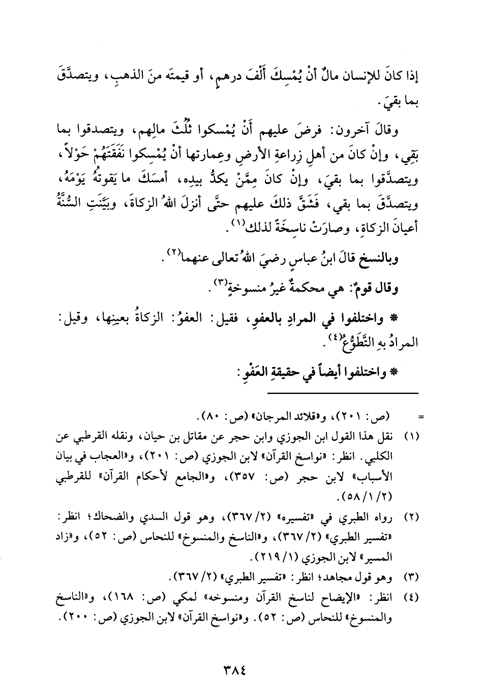 * واختلفوا في المرادِ بالعفوِ، فقيل: العفوُ: الزكاةُ بعينِها، وقيل: المرادُ بهِ التَّطَوع (¬4).