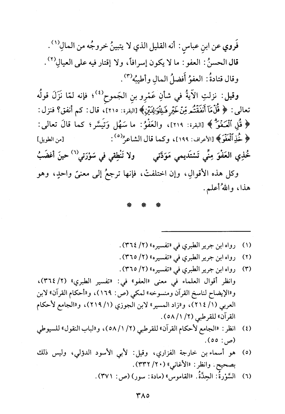 وانظر أقوال العلماء في معنى "العفو" في: "تفسير الطبري" (2/ 364)، و"الإيضاح لناسخ القرآن ومنسوخه" لمكي (ص: 169)، و"أحكام القرآن" لابن العربي (1/ 214)، و"زاد المسير" لابن الجوزي (1/ 219)، و"الجامع لأحكام القرآن" للقرطبي (2/ 1/ 58).