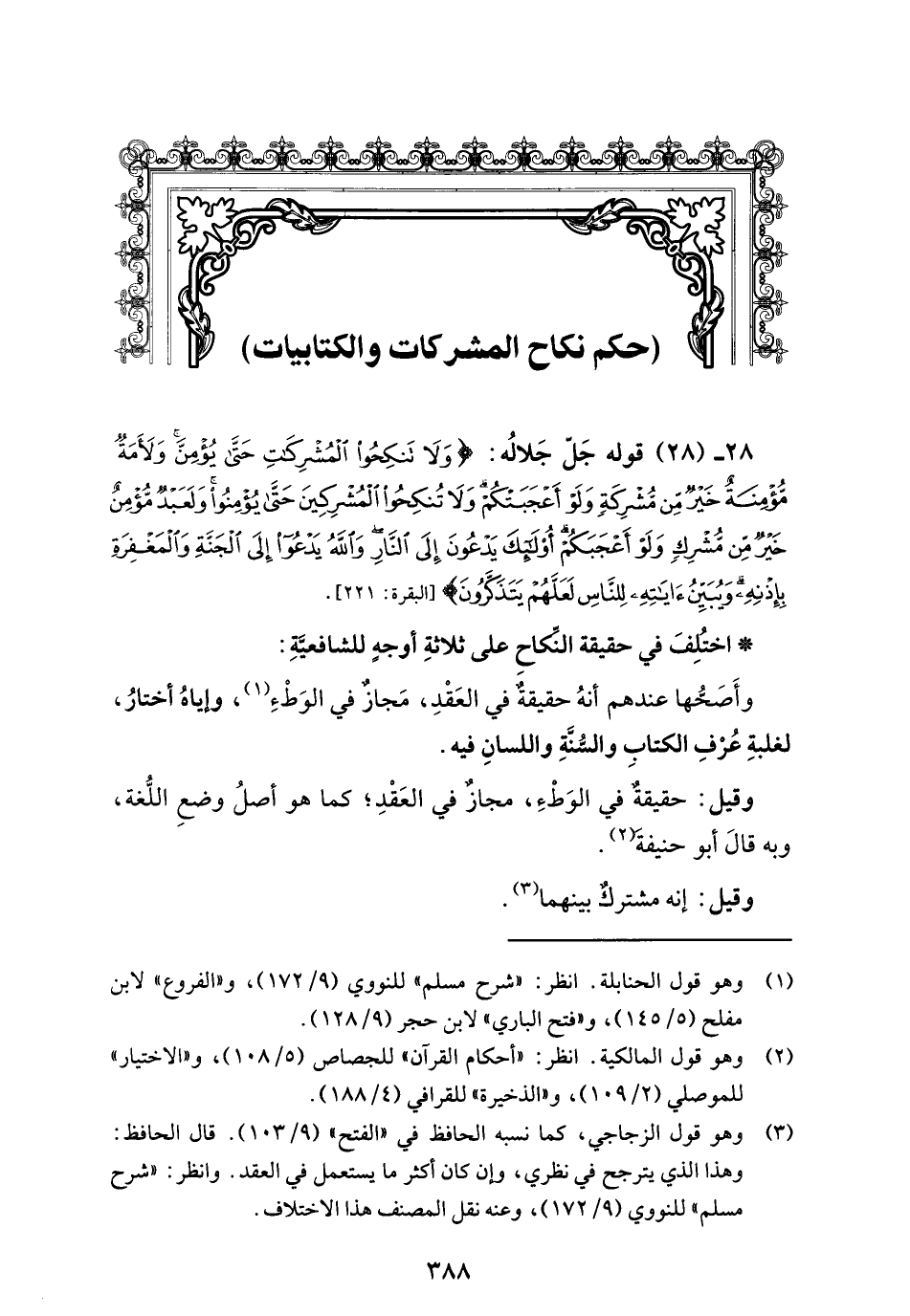 28 - (28) قوله جَلّ جَلالُه: {وَلَا تَنْكِحُوا الْمُشْرِكَاتِ حَتَّى يُؤْمِنَّ وَلَأَمَةٌ مُؤْمِنَةٌ خَيْرٌ مِنْ مُشْرِكَةٍ وَلَوْ أَعْجَبَتْكُمْ وَلَا تُنْكِحُوا الْمُشْرِكِينَ حَتَّى يُؤْمِنُوا وَلَعَبْدٌ مُؤْمِنٌ خَيْرٌ مِنْ مُشْرِكٍ وَلَوْ أَعْجَبَكُمْ أُولَئِكَ يَدْعُونَ إِلَى النَّارِ وَاللَّهُ يَدْعُو إِلَى الْجَنَّةِ وَالْمَغْفِرَةِ بِإِذْنِهِ وَيُبَيِّنُ آيَاتِهِ لِلنَّاسِ لَعَلَّهُمْ يَتَذَكَّرُونَ} [البقرة:221].