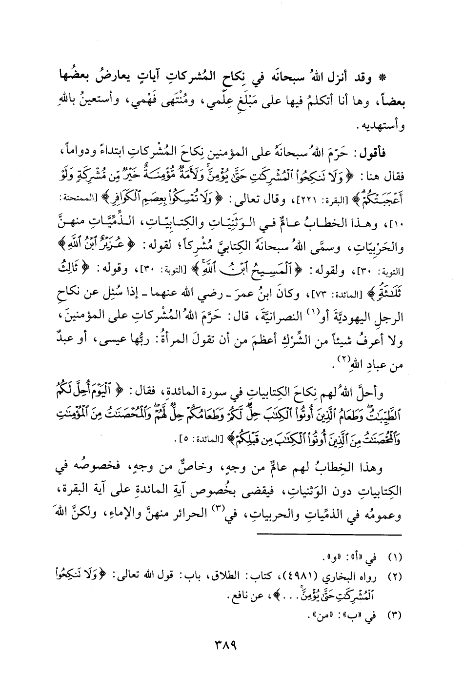 فأقول: حَرّمَ اللهُ سبحانَهُ على المؤمنين نِكاحَ المُشْركاتِ ابتداءً ودواماً، فقال هنا: {وَلَا تَنْكِحُوا الْمُشْرِكَاتِ حَتَّى يُؤْمِنَّ وَلَأَمَةٌ مُؤْمِنَةٌ خَيْرٌ مِنْ مُشْرِكَةٍ وَلَوْ أَعْجَبَتْكُمْ} [البقرة: 221]، وقال تعالى: {وَلَا تُمْسِكُوا بِعِصَمِ الْكَوَافِرِ} [الممتحنة: 10]، وهذا الخطابُ عامّ في الوَثَنِيّاتِ والكِتابِيّاتِ، الذِّمِّيَّاتِ منهنَّ والحَرْبِيّاتِ، وسمَّى اللهُ سبحانَهُ الكِتابيَّ مُشْرِكاً؛ لقوله: {عُزَيْرٌ ابْنُ اللَّهِ} [التوبة: 30]، ولقوله: {الْمَسِيحُ ابْنُ اللَّه} [التوبة: 30]، وقوله: {ثَالِثُ ثَلَاثَةٍ} [المائدة: 73]، وكانَ ابنُ عمرَ- رضي الله عنهما- إذا سُئِل عن نكاحِ الرجلِ اليهوديَّةَ أو (¬1) النصرانيَّةَ، قال: حَرَّمَ اللهُ المُشْركاتِ على المؤمنينَ، ولا أعرفُ شيئاً من الشِّرْكِ أعظمَ من أن تقولَ المرأةُ: ربُّها عيسى، أو عبدٌ من عبادِ اللهِ (¬2).