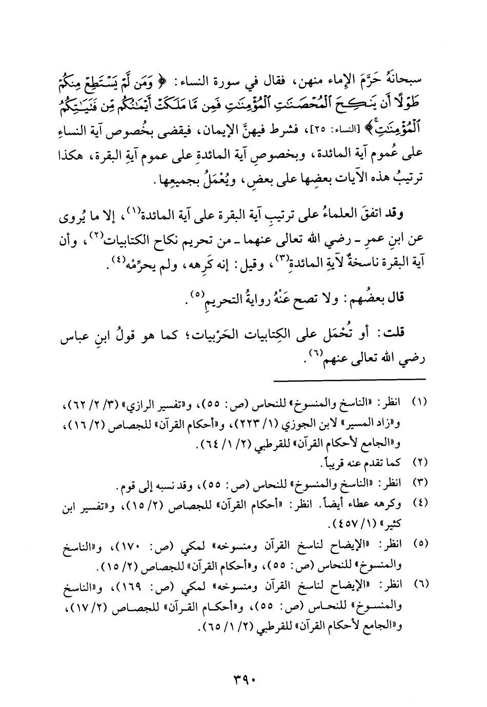 وقد اتفقَ العلماءُ على ترتيبِ آية البقرة على آية المائدة (¬1)، إلا ما يُروى عن ابنِ عمرِ -رضي الله تعالى عنهما- من تحريم نكاح الكتابيات (¬2)، وأن آية البقرة ناسخة لآيةِ المائدةِ (¬3)، وقيل: إنه كَرِهه، ولم يحرِّمْه (¬4).