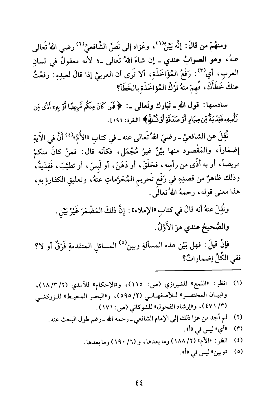 نُقِلَ عن الشافعيِّ -رضيَ اللهُ تَعالى عنه- في كتابِ "الأُمِّ" (¬4) أَنَّ في الآيةِ إِضمْاراً، والمَقْصود منها بيِّنٌ غيرُ مُجْمَل، فكأنه قال: فمنْ كانَ منكمْ مريضاً، أو به أذًى من رأسِه، فحَلَقَ، أو دَهَنَ، أو لَبِسَ، أو تطيَّبَ، فَفِدْيةٌ، وذلك ظاهر من قصدِهِ في رَفْعِ تَحريمِ المُحَرَّماتِ عنهُ، وتعليقِ الكفارةِ بهِ، هذا معنى قوله، رحمهُ اللهُ تعالى.