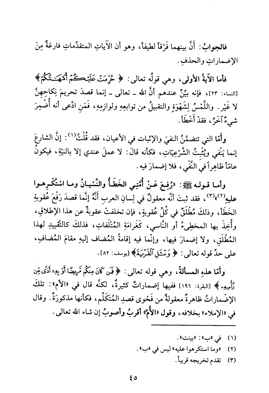 وأما قوله - صلى الله عليه وسلم -: "رُفِعَ عَنْ أُمَّتِي الخَطَأُ والنِّسْيانُ وما اسْتُكْرِهوا عليهِ (¬2) " (¬3)، فقد ثبتَ أنَّه معقولٌ في لِسانِ العربِ أَنَّهُ إنَّما قصدَ رَفْعَ عُقوبةِ الخَطَأ، وذلكَ مُطْلَقٌ في كُلِّ عُقوبةٍ، فإن تخلفتْ عقوبةٌ عن هذا الإطلاقِ، وأُخِذَ بها المخطِئُ أو النَّاسي، كَغَرامَةِ المُتْلَفاتِ، فذلكَ كالتَّقييدِ لهذا المُطْلَقِ، ولا إضمارَ فيها، وإنّما فيه إقامةُ المُضاف إليهِ مقامَ المُضافِ، على حدِّ قوله تعالى: {وَاسْأَلِ الْقَرْيَةَ} [يوسف: 82].