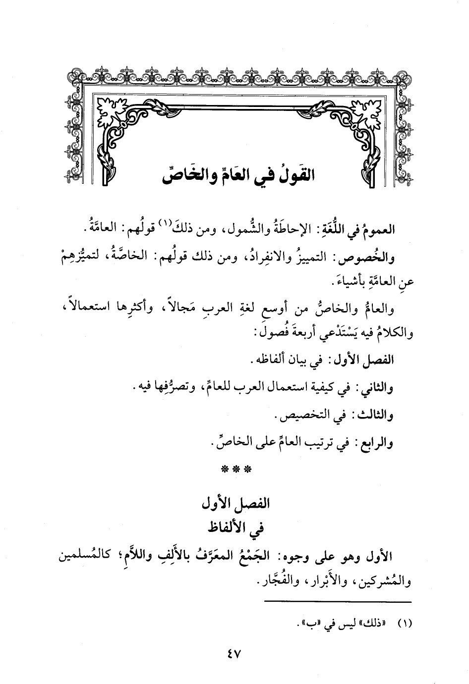 والعامُّ والخاصُّ من أوسعِ لغةِ العربِ مَجالاً، وأكثرِها استعمالاً، والكلامُ فيه يَسْتَدْعي أربعةَ فُصول: