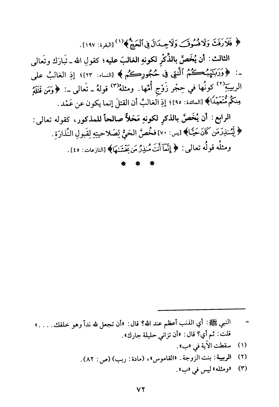 الثالث: أن يُخَصَّ بالذكْرِ لكونهِ الغالبَ عليه؛ كقولِ الله -تبَارَك وتَعالى -: {وَرَبَائِبُكُمُ اللَّاتِي فِي حُجُورِكُمْ} [النساء: 23]؛ إذِ الغالبُ على الربيبَةِ (¬2) كونُها في حِجْر زَوْجِ أُمِّها. ومثلهُ (¬3) قولهُ -تَعالى-: {وَمَنْ قَتَلَهُ مِنْكُمْ مُتَعَمِّدًا} [المائدة: 95]؛ إذِ الغالبُ أن القتلَ إنما يكون عن عَمد.